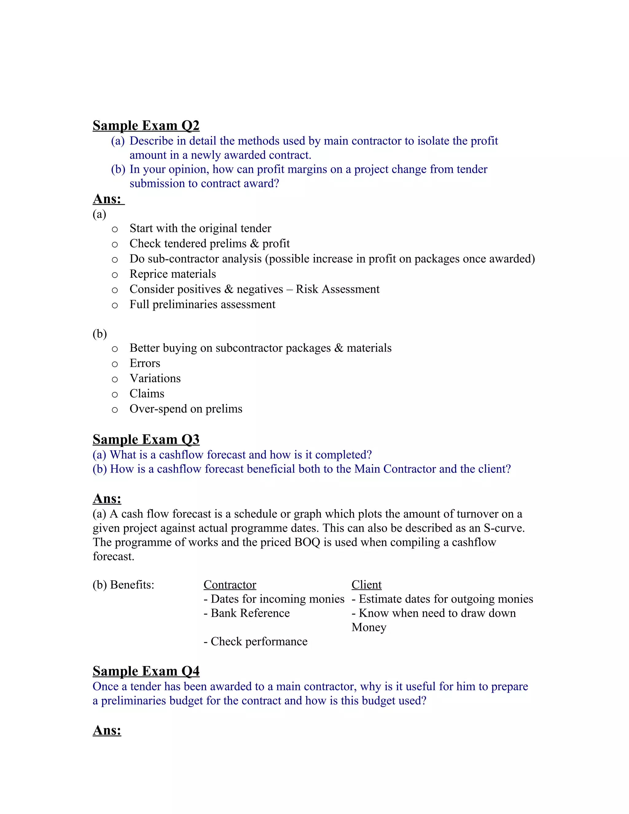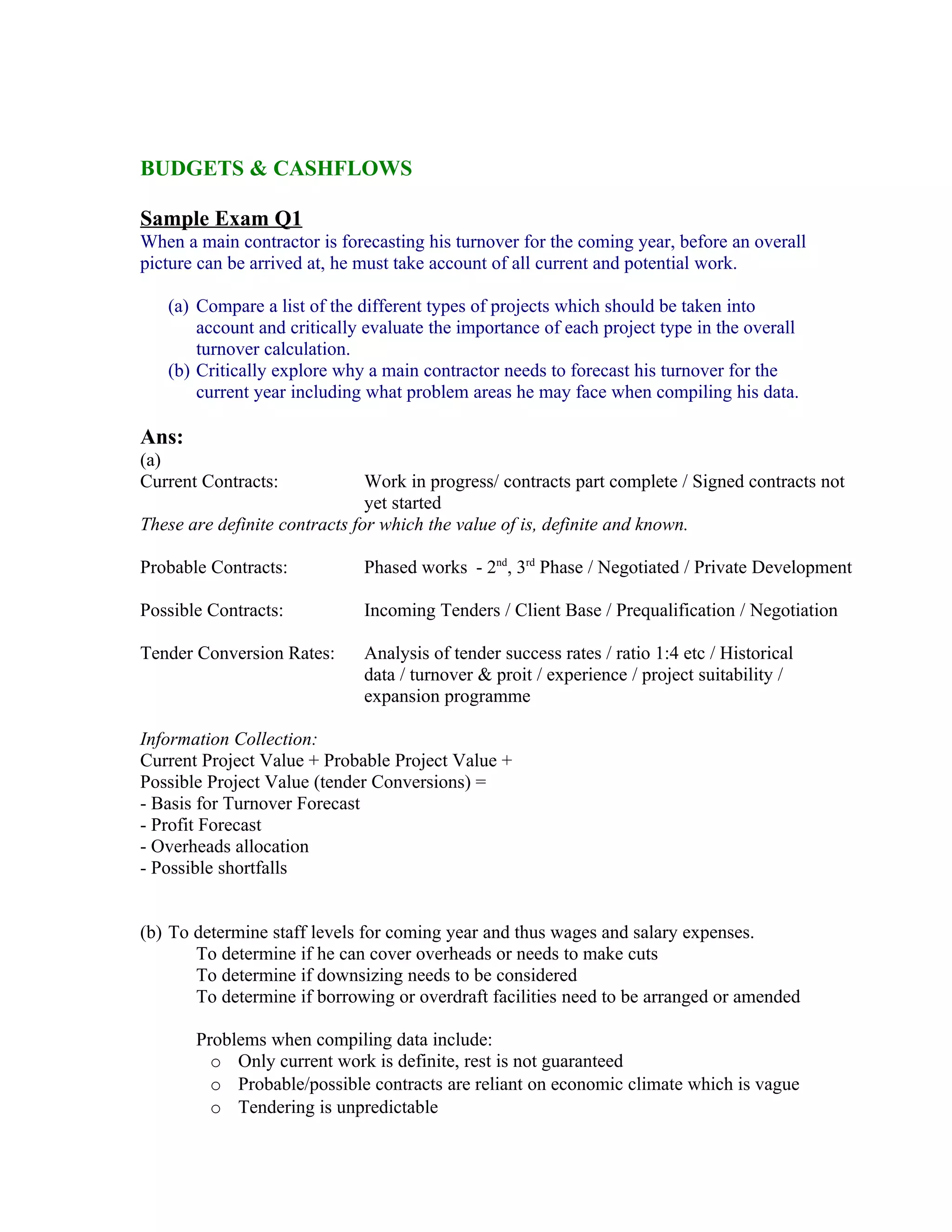 A main contractor must forecast turnover for the coming year by considering current, probable, and possible projects. This helps determine staffing needs, overheads, profits, and potential shortfalls. However, forecasting is challenging as only current work is definite, and future work depends on economic conditions and tender outcomes. Calculating accurate cashflows is also important for the contractor and client to plan finances.