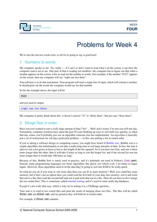 The document provides instructions for 5 programming problems as part of a weekly challenge. Problem 1 involves writing a program to convert numbers to words. Problem 2 asks to merge two sorted text files. Problem 3 is to modify an encryption program to encrypt user input while preserving non-letter characters. Problem 4 requires generating banner text from a font file and user input. Problem 5 checks for duplicates in a Sudoku puzzle given as user input.