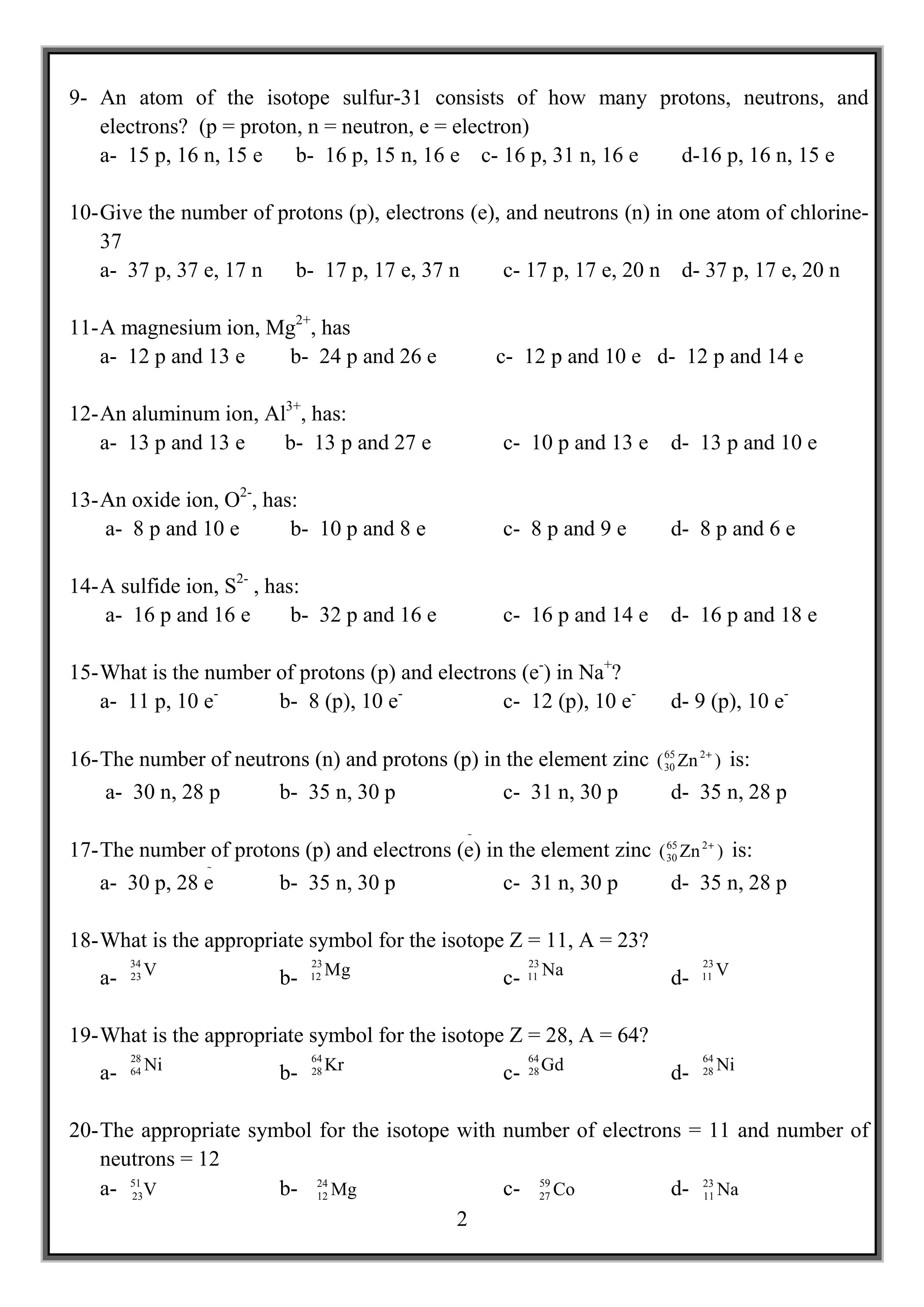 2) Properties of atoms such as mass number, atomic number, isotopes.