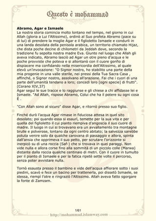 Il documento narra la storia di Abramo, Agar e Ismaele, sottolineando la loro migrazione nell'Hijaz e il miracolo della sorgente di Zamzam. Si descrivono le ere successive e l'importanza della Ka'ba, il culto dell'unità di Dio e il ritrovamento di Zamzam da parte di Abd al-Muttalib, culminando nel voto di sacrificare il suo figlio Abdullah. Inoltre, si menziona l'anno dell'elefante, evento che portò alla nascita di Muhammad.