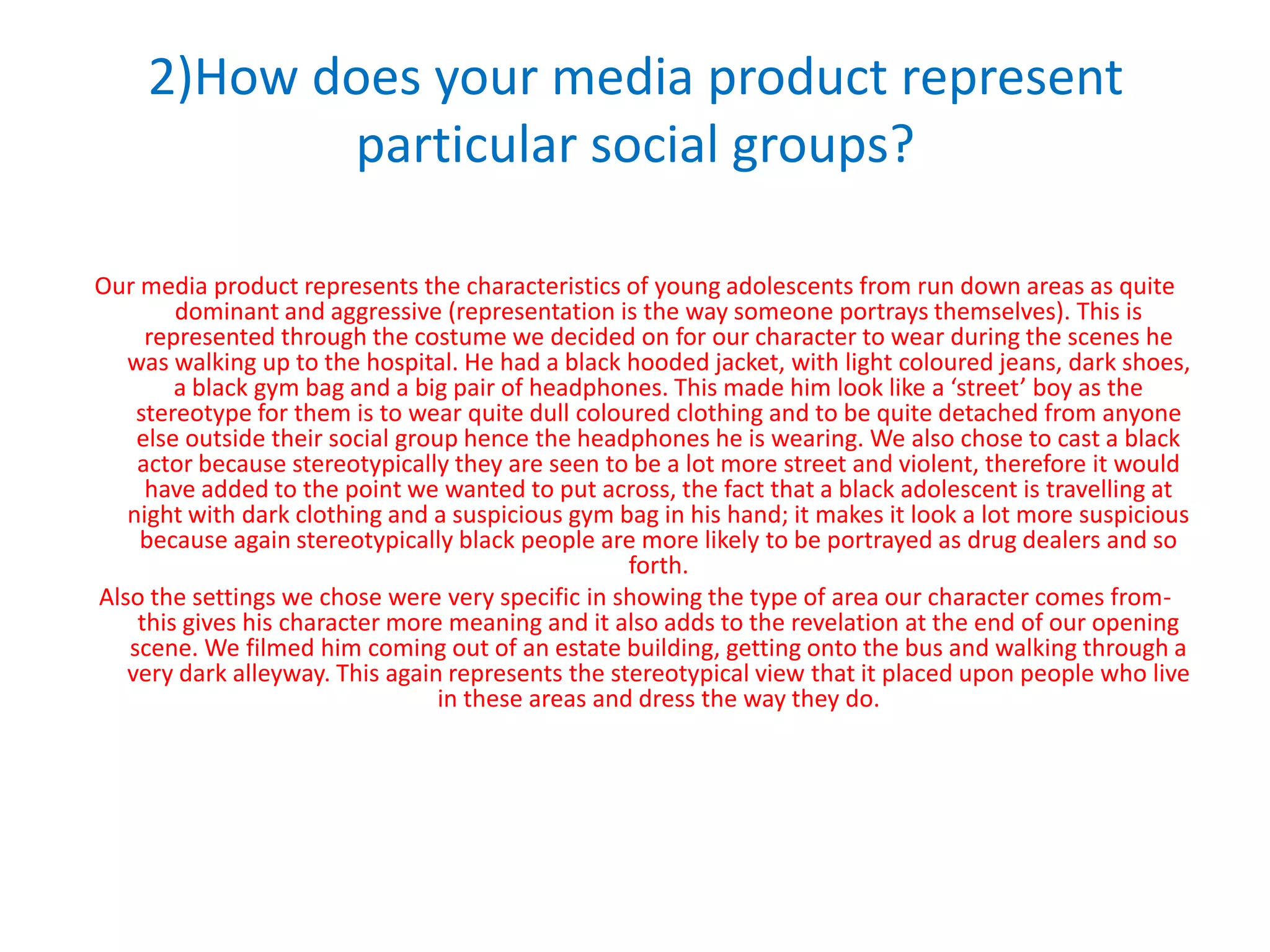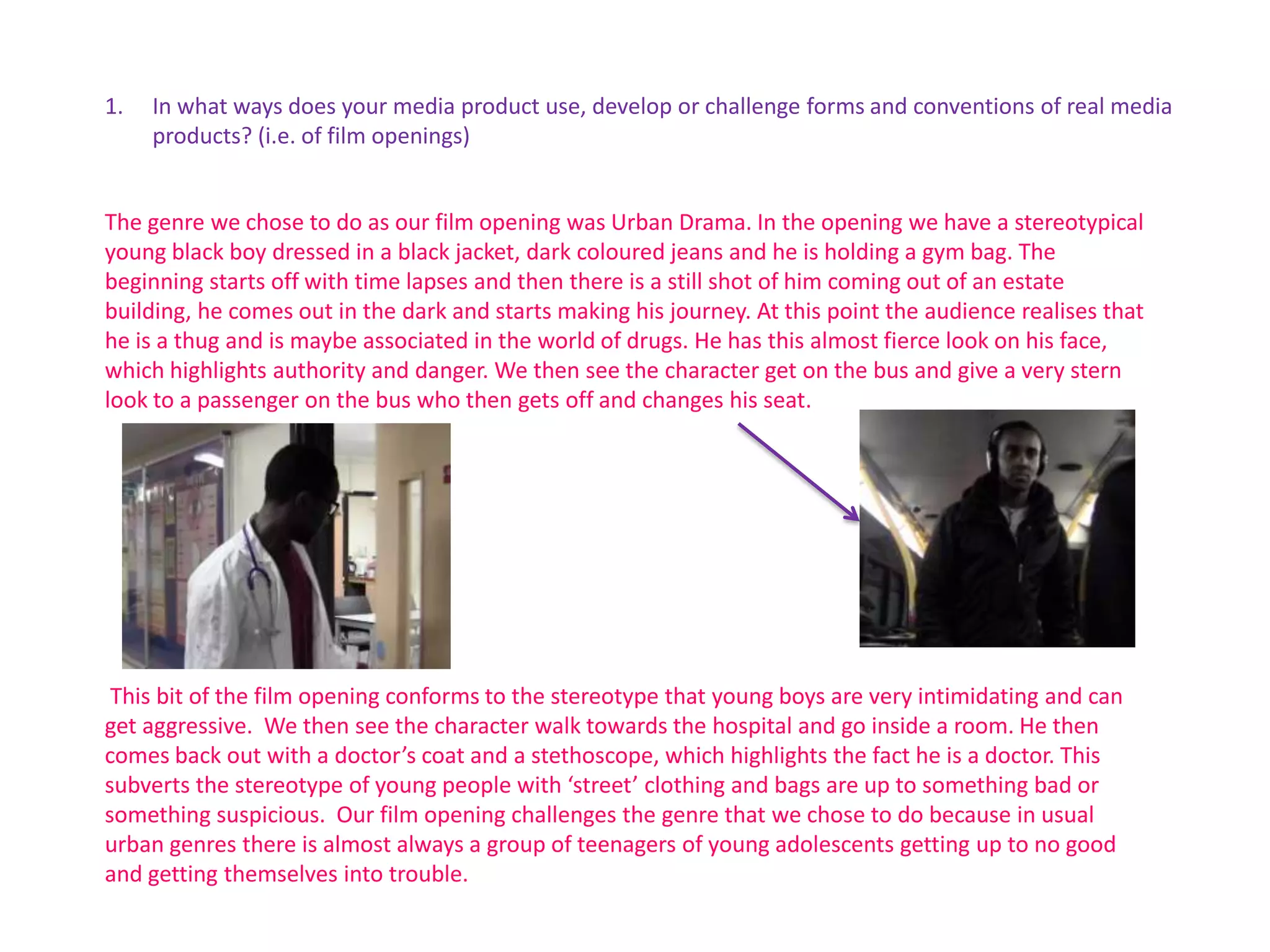 This document summarizes a film opening that uses and challenges conventions of the urban drama genre. The opening initially portrays a young black boy dressed in stereotypical "street" clothing as intimidating and possibly involved with drugs. However, it subverts expectations when he enters a hospital and is revealed to be a doctor. This challenges the genre's typical portrayal of youths as constantly getting into trouble. The film also represents the social group of young people from run-down areas through the protagonist's clothing and settings involving housing estates, buses, and alleyways. It acknowledges that this portrayal reinforces stereotypes about those who live in such areas.