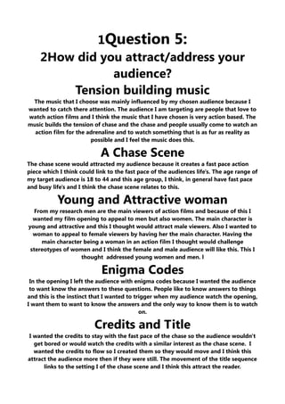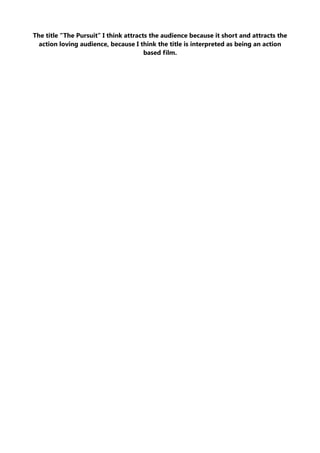 The document discusses different techniques used in a film opening to attract the target audience of action film fans aged 18-44. A chase scene was included to create fast-paced tension. The main character is a young, attractive woman, intended to appeal to both male and female viewers by challenging stereotypes. Enigma codes were left unsolved to intrigue audiences into watching more. Credits were designed to flow with movement like the chase scene to maintain interest and link the title "The Pursuit" to action.