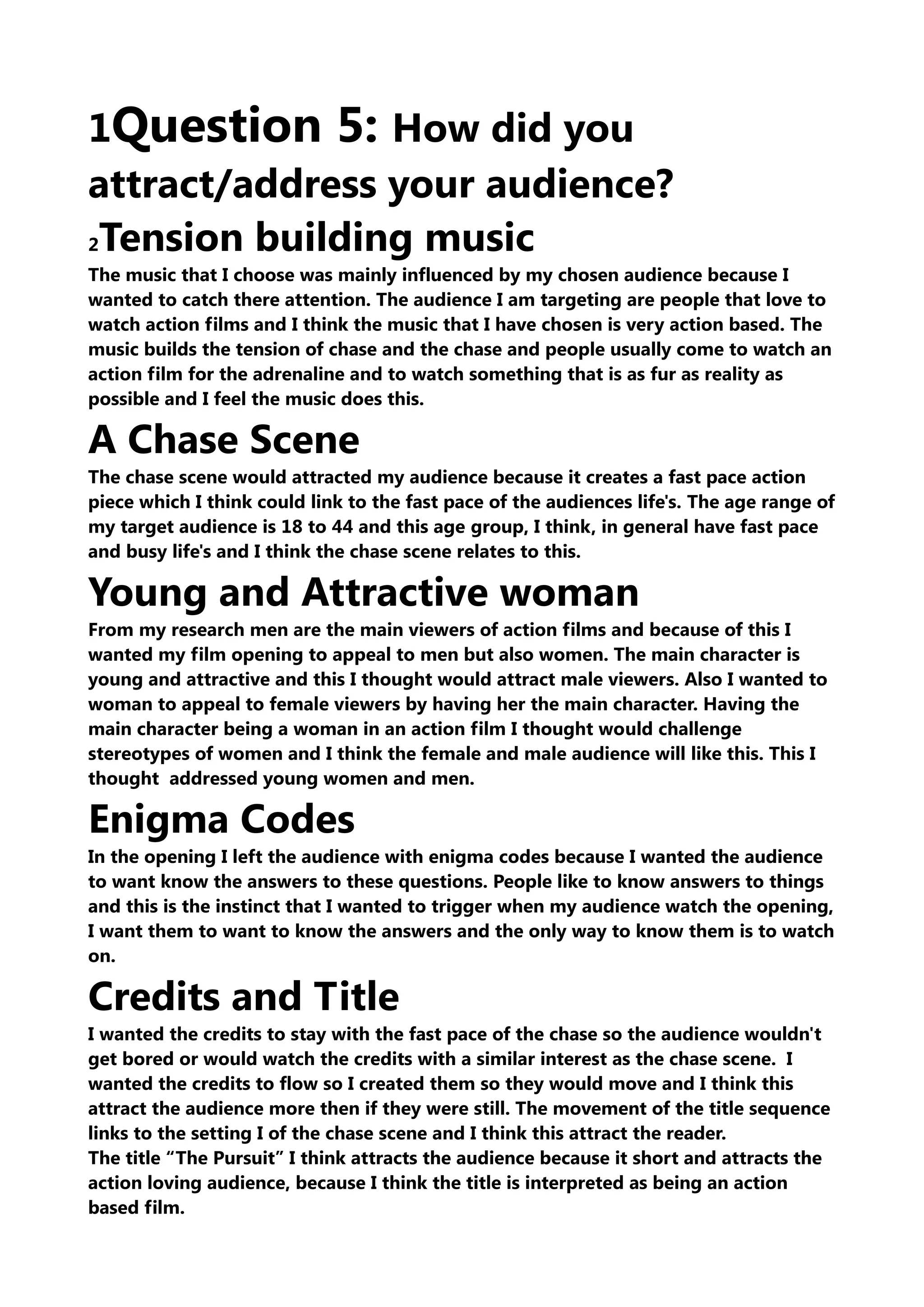 The document discusses different techniques used in a film opening to attract the target audience of action film fans aged 18-44. A chase scene was included to create fast-paced tension, while the main character being an attractive young woman was meant to appeal to both male and female viewers. Enigma codes were also left unresolved to trigger the audience's curiosity and desire to learn the answers by continuing to watch. Moving credits were used to maintain the fast pace and interest level established by the chase scene.