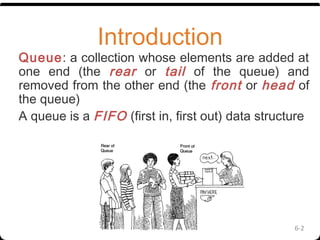 The document discusses different types of queues including linear queue, circular queue, and double ended queue (deque). It provides algorithms for common queue operations like insertion and deletion. For linear and circular queues, insertion adds to the rear and deletion removes from the front. Deque allows insertion and deletion from both front and rear, and there are two types - input restricted allows insertion only at rear, output restricted allows deletion only at front.
