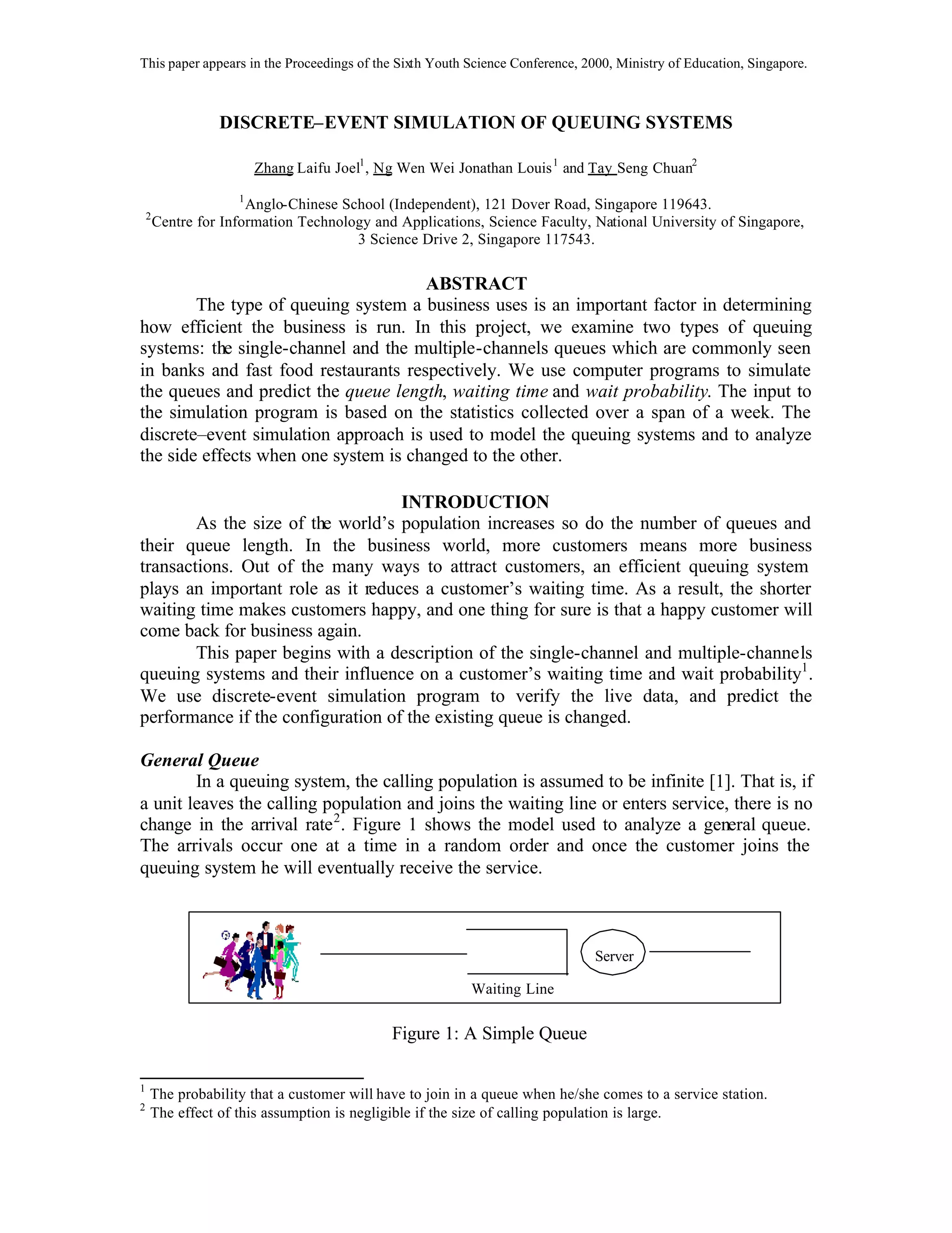 This document summarizes a study that uses discrete-event simulation to analyze the performance of single-channel and multiple-channel queuing systems. Data was collected from a bank (POSB) using a single queue and a fast food restaurant (McDonalds) using multiple queues. Simulation results found that converting McDonalds to a single queue reduced average queue length by 48% and wait time by 9 times, while converting POSB to multiple queues significantly increased wait times. Therefore, a single queue is more efficient for customer service.