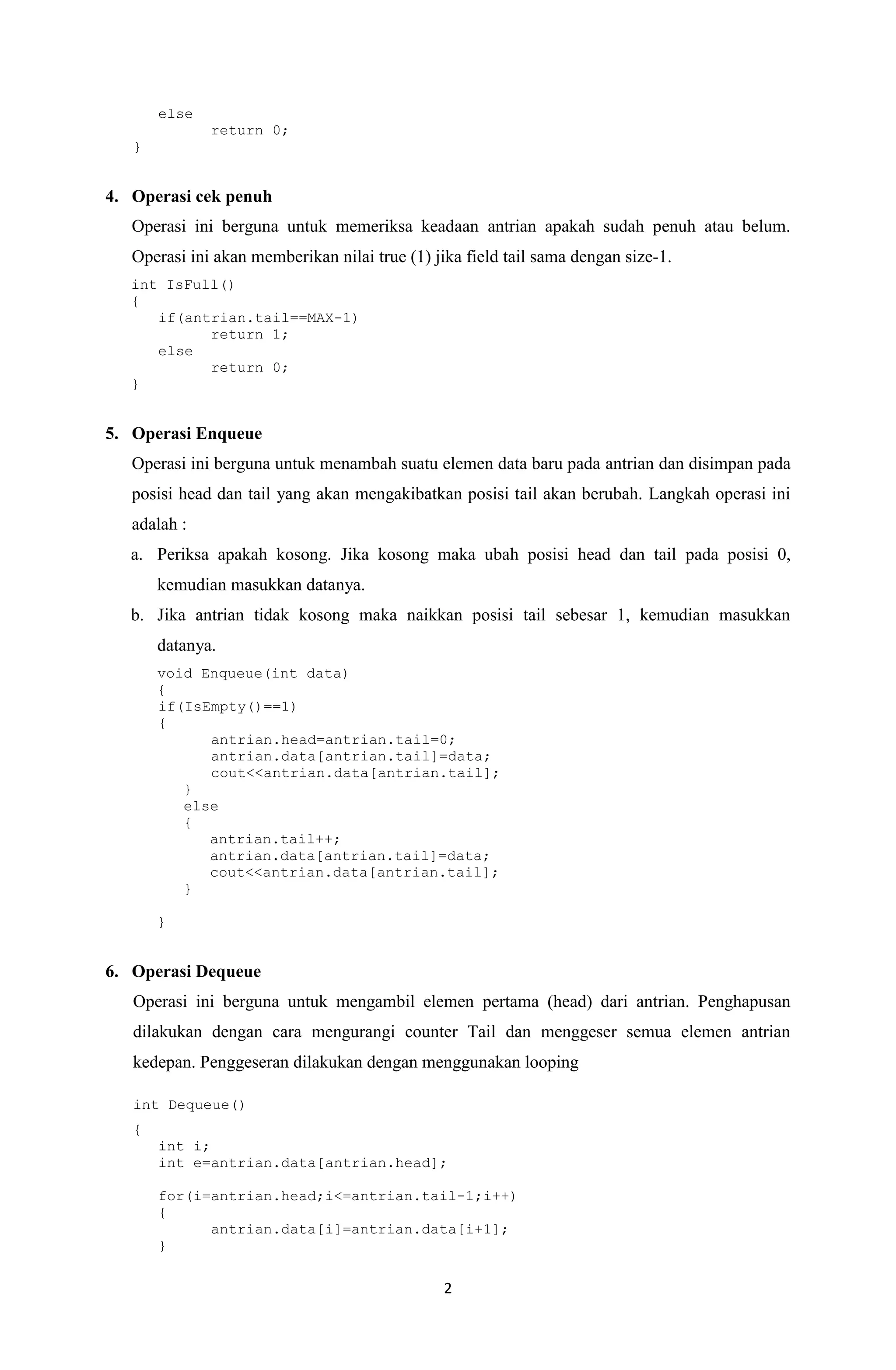 Dokumen ini menjelaskan tentang struktur data antrian (queue) yang mengikuti prinsip FIFO. Terdapat berbagai operasi terkait antrian seperti enqueue, dequeue, serta pemeriksaan keadaan kosong atau penuh, yang dapat diimplementasikan dengan menggunakan array atau linked list. Selain itu, terdapat contoh kode dalam bahasa pemrograman C untuk setiap operasi yang relevan.