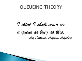 Queueing theory studies waiting line systems where customers arrive for service but servers have limited capacity. This document outlines components of queueing models including: arrival processes, queue configurations, service disciplines, service facilities, and analytical solutions. Key points are that customers wait in queues when demand exceeds server capacity, and queueing formulas provide expected wait times and number of customers in the system based on arrival and service rates.