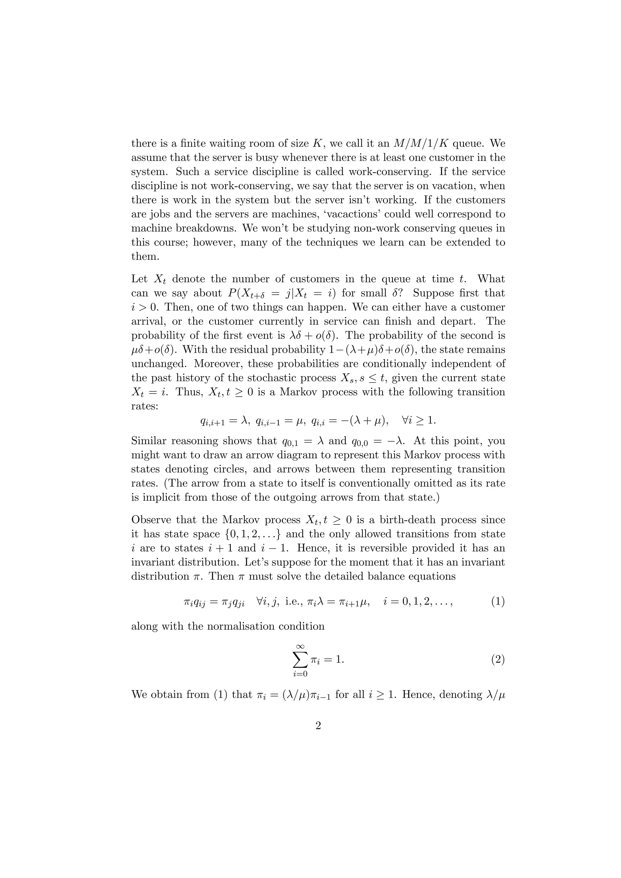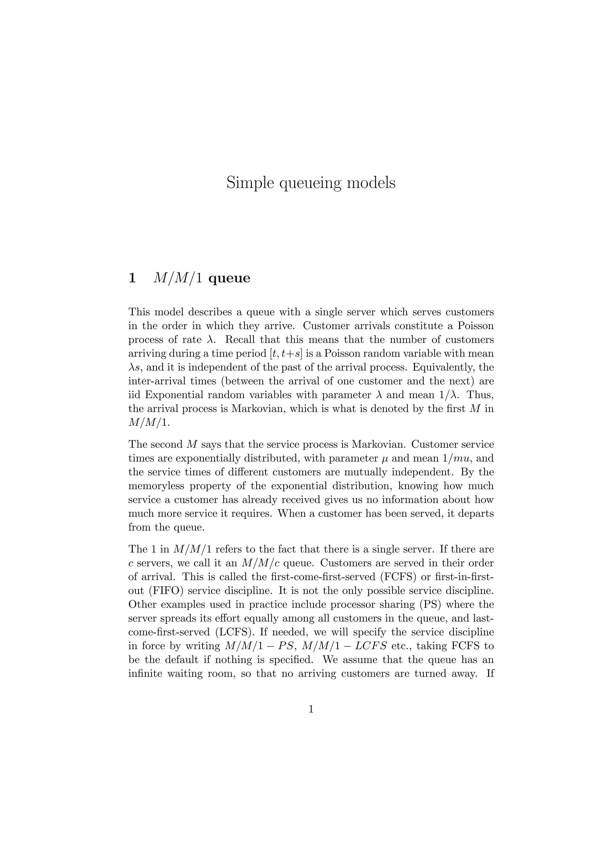 [1] It describes the M/M/1 queue where arrivals and service times are exponentially distributed and there is a single server. The queue length over time is a Markov process.
