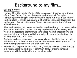 The film is set in 1954 America and follows Detective Inspector Bishop who secretly murders those he feels threaten him. Locations chosen conform to noir conventions by feeling dark, cold, and claustrophobic. Costumes for the detective and female lead take inspiration from both classic noir and modern interpretations. Editing stays faithful to noir through black and white cinematography and high contrasts while introducing some color. Music and lighting experiment with conventions to add modern flair. Overall, the film aims to honor noir traditions while updating certain elements for contemporary audiences