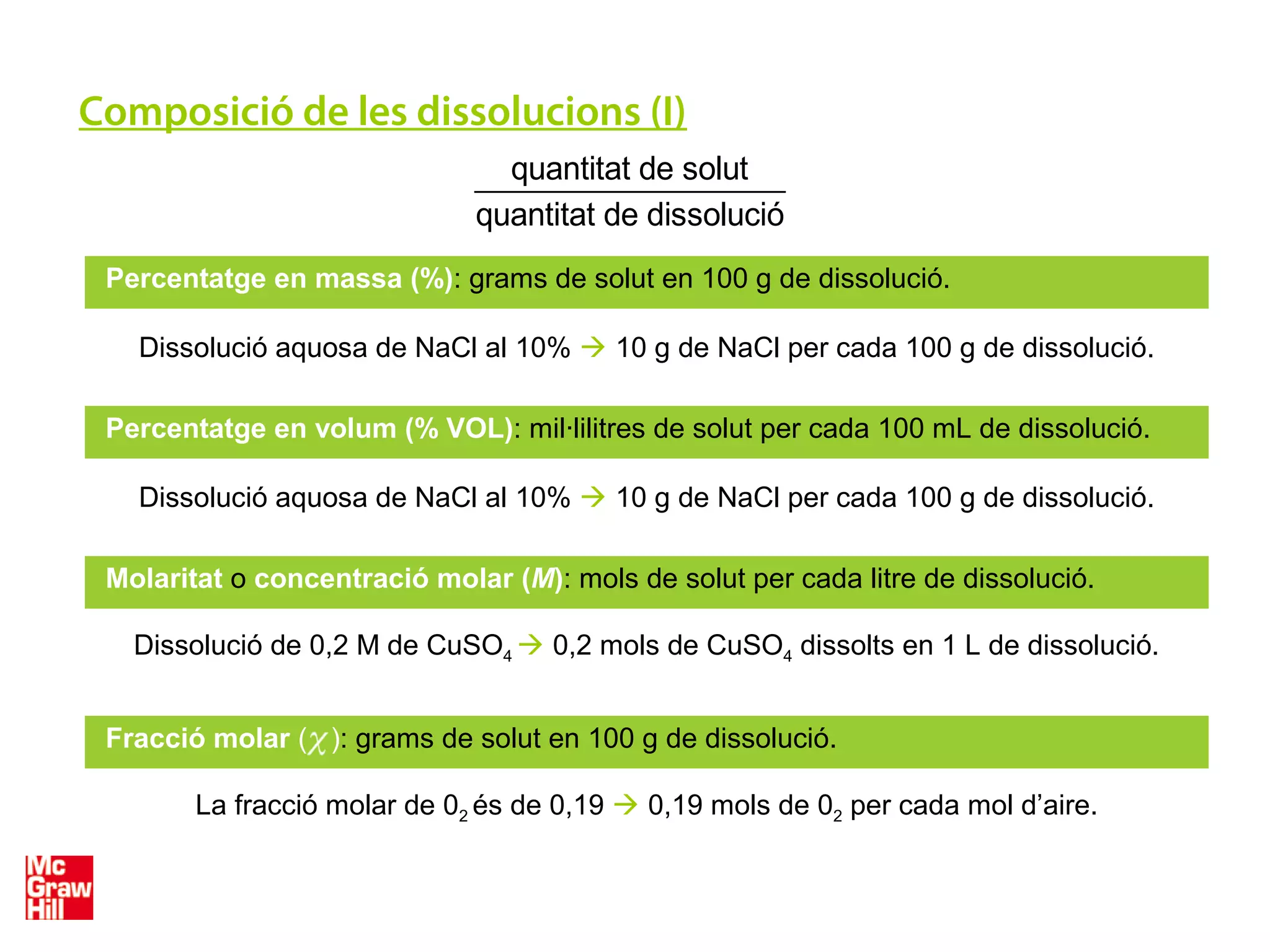 Percentatge en massa (%): grams de solut en 100 g de dissolució.