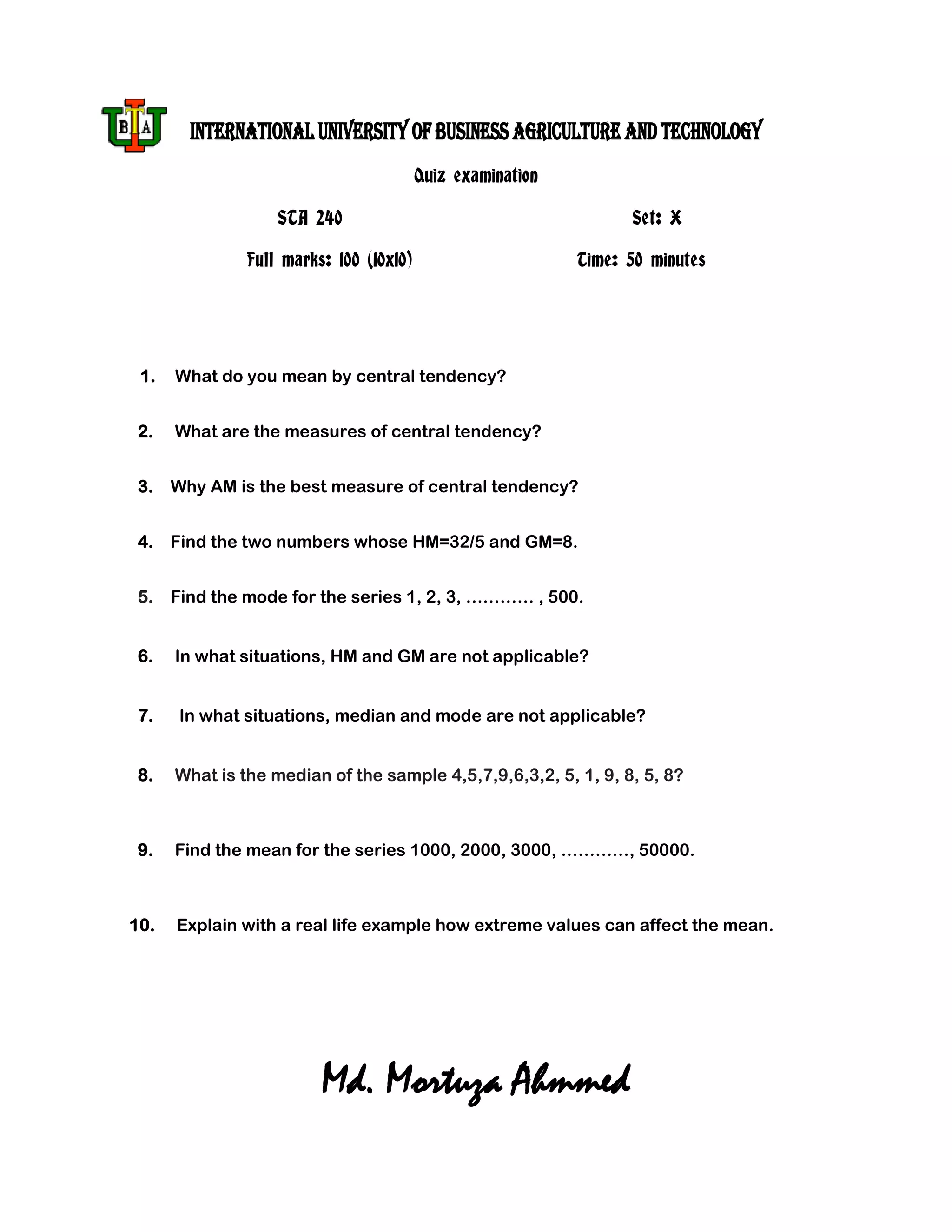 This document contains a 10 question quiz for a statistics course. The quiz covers topics related to measures of central tendency including mean, median, mode, harmonic mean and geometric mean. Questions ask students to define and calculate these measures, as well as explain situations where some measures are not applicable or how extreme values can affect the mean. The quiz is worth a total of 100 marks and must be completed within 50 minutes.