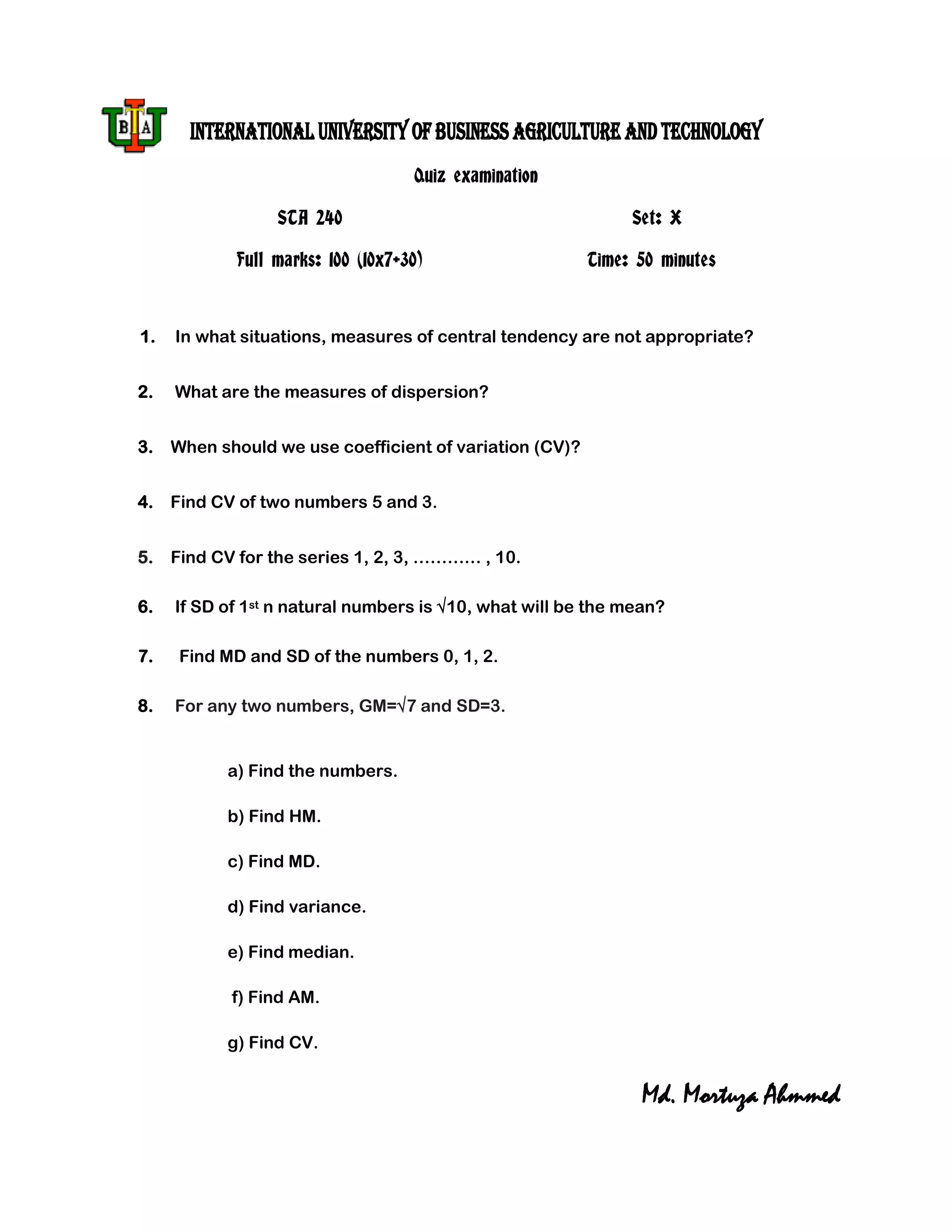 This document contains a quiz examination for the course STA 240 with 7 multiple choice questions testing concepts related to measures of central tendency, dispersion, coefficient of variation, mean, standard deviation, median, geometric mean, harmonic mean, and mode. The quiz is out of 100 marks with 10 marks allocated to each question and an additional 30 marks. Students have 50 minutes to complete the quiz.