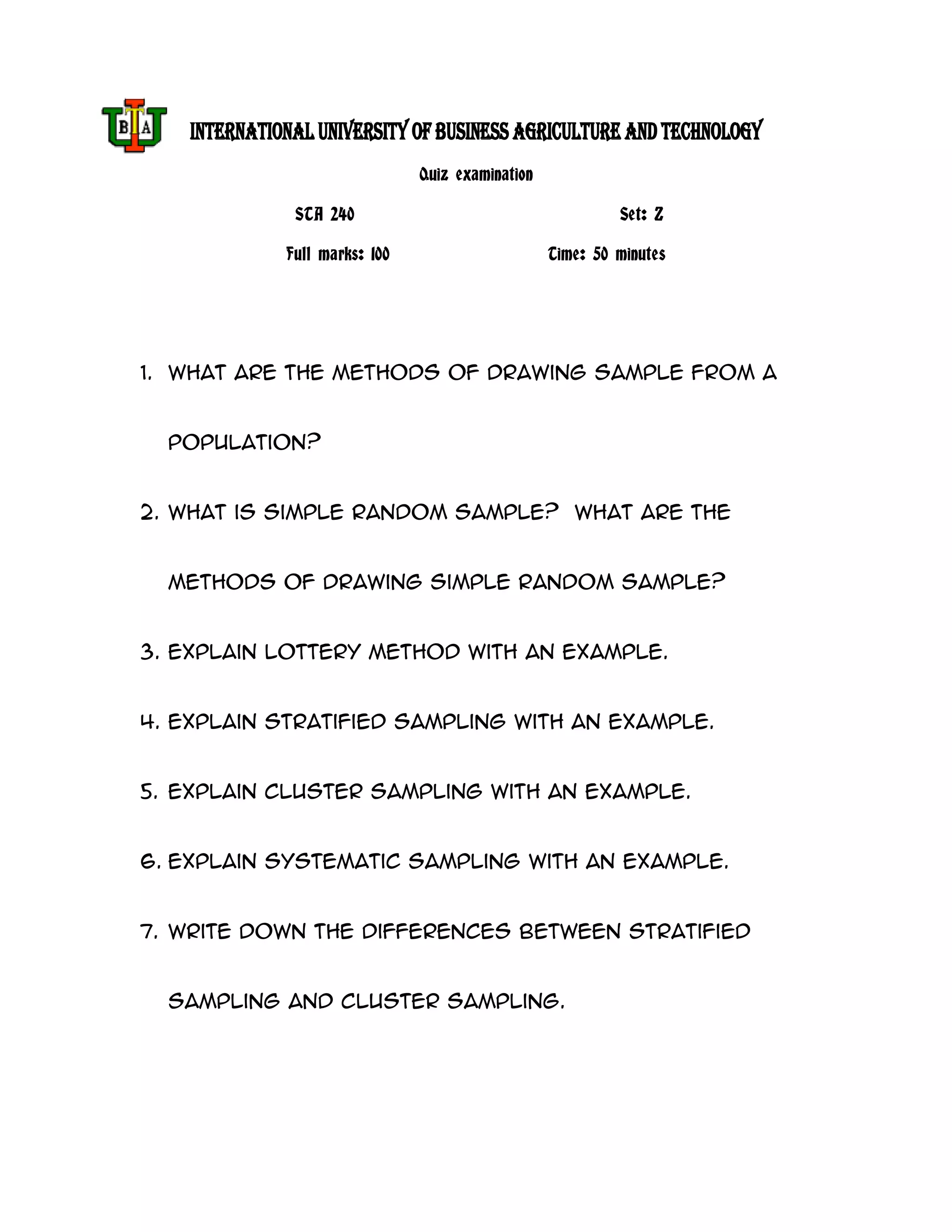This document appears to be a quiz examination for a statistics course consisting of 7 multiple choice or short answer questions. The questions cover key topics in statistics sampling including different sampling methods such as simple random sampling, stratified sampling, cluster sampling, and systematic sampling. The examinee is asked to define these sampling techniques and provide examples of each. They are also asked to compare and contrast stratified sampling versus cluster sampling.