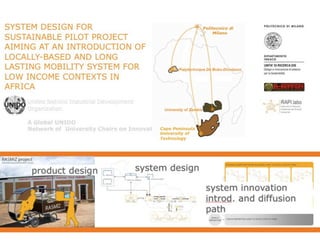 The document discusses the need for radical change towards more sustainable practices and outlines four levels of design intervention: 1) redesigning existing products and services to be more sustainable, 2) designing new sustainable replacements, 3) designing sustainable systems of interconnected products and services, and 4) proposing new sustainable lifestyle scenarios. It emphasizes that design should connect technical possibilities to environmental necessities by formulating socially and culturally attractive new proposals through strategic coordination of products, communication, and services.