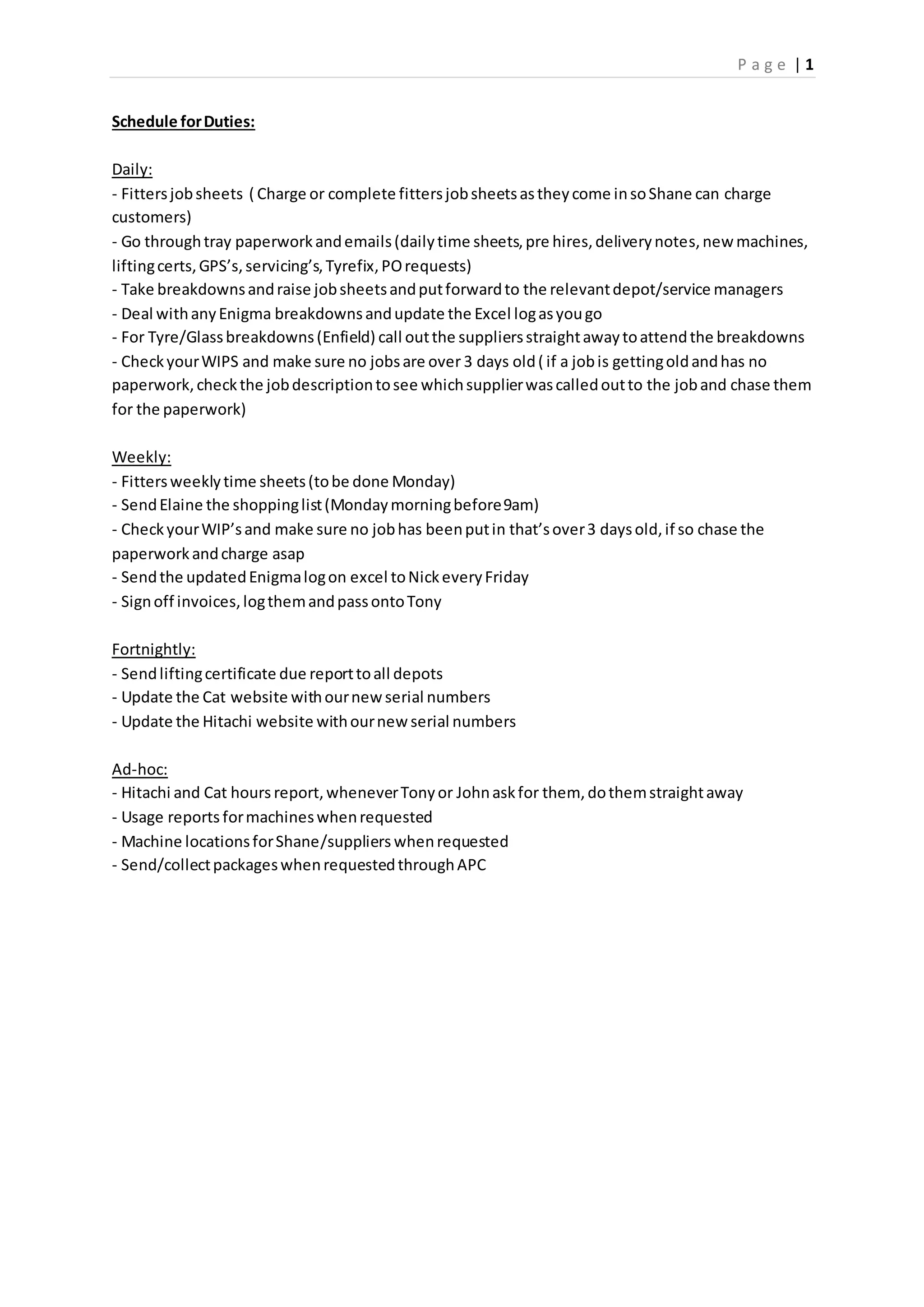This document provides service guidelines for Ana Raquel covering various tasks including scheduling duties, handling breakdowns and raising job sheets, completing paperwork like delivery notes and service sheets, managing pre-hire machines, submitting holiday requests, updating equipment on tracking systems, and processing purchase orders and lifting certificates. Key responsibilities include responding to breakdown calls, managing job sheets and paperwork, updating websites and logs, and coordinating with suppliers.