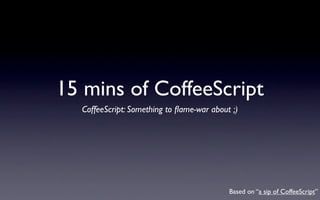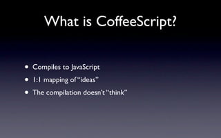 CoffeeScript is a programming language that compiles to JavaScript. It provides a more concise syntax while maintaining a 1:1 mapping to JavaScript concepts. Some key features of CoffeeScript include implicit returns from functions, optional function parameters, and chaining comparisons. While it adds another layer to learn, CoffeeScript allows for writing cleaner code that compiles down to equivalent JavaScript.