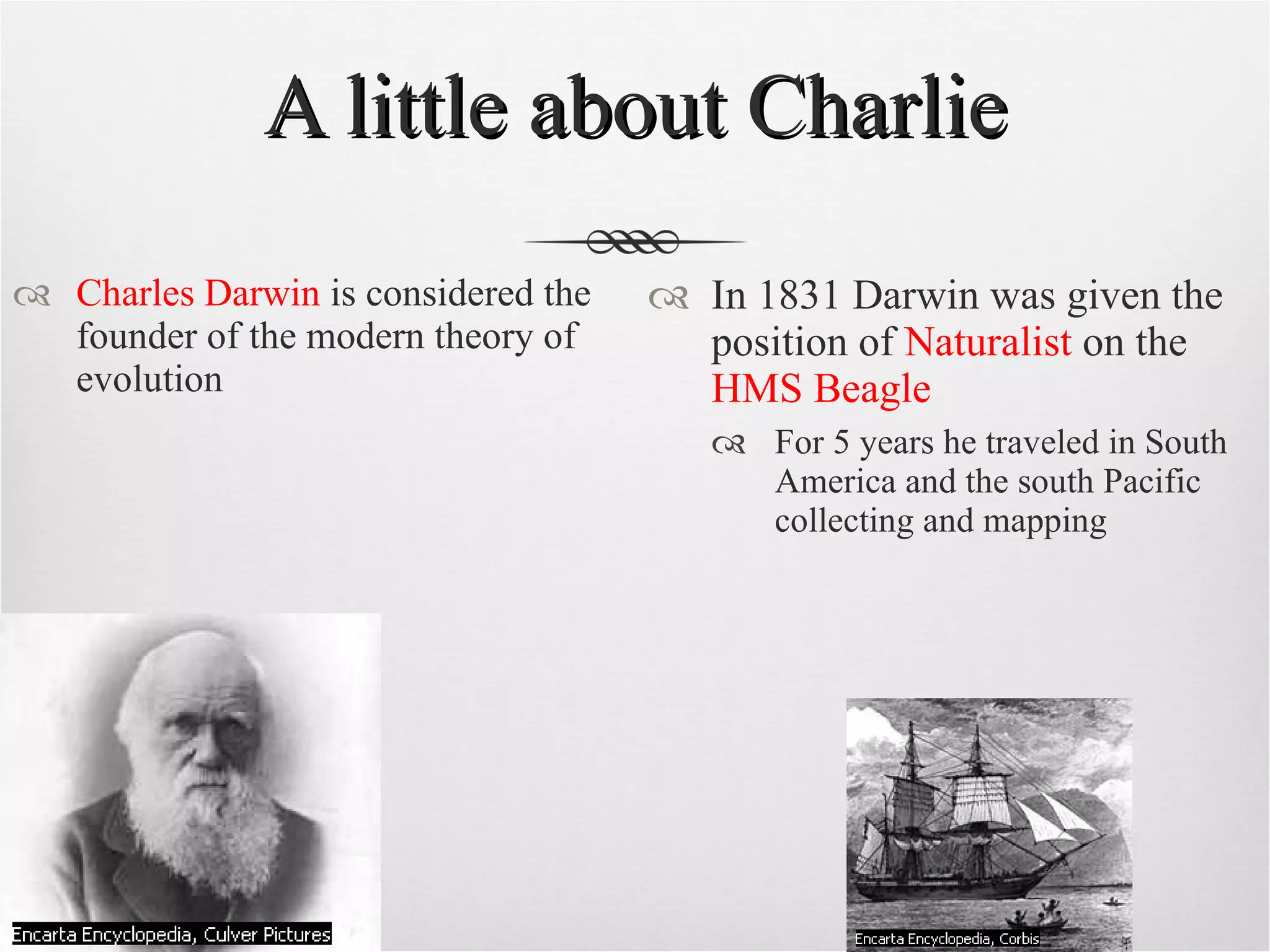 Charles Darwin is considered the founder of the modern theory of evolution. He traveled for 5 years as the naturalist on the HMS Beagle, collecting and mapping in South America and the Pacific, including the Galapagos Islands. Darwin observed natural selection, where individuals with variations favorable for their environment, such as a fast fish with camouflage, are more likely to survive and pass on their traits, causing populations to change over many generations as the offspring of survivors make up a larger proportion.