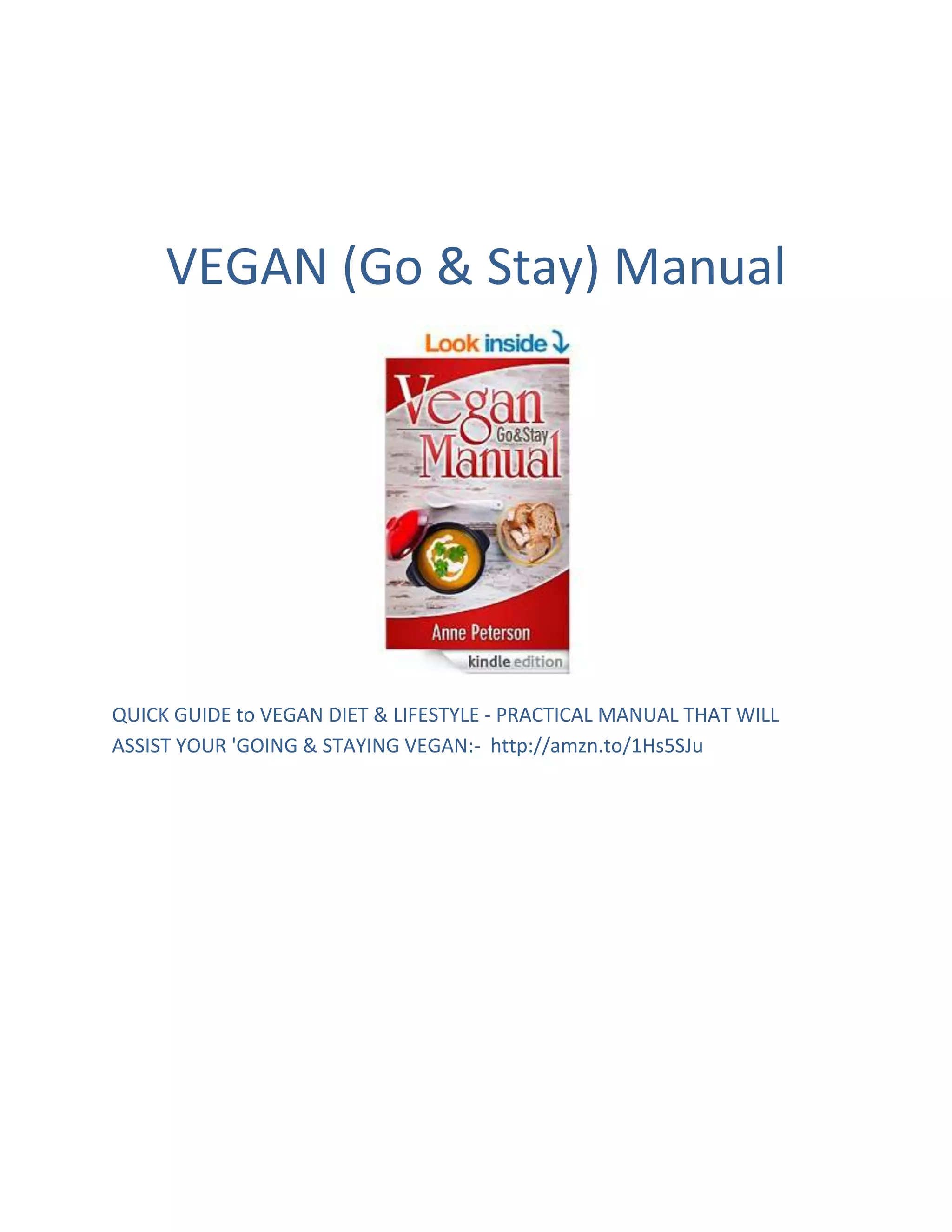 This document is a quick guide and practical manual for going and staying vegan that provides assistance on the vegan diet and lifestyle. It offers guidance on transitioning to a plant-based diet as well as maintaining a vegan diet and lifestyle long-term. The manual can be found online at the provided URL.