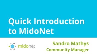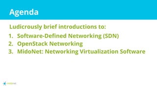 This document provides a quick introduction to MidoNet, a networking virtualization software plugin for OpenStack Neutron. It first briefly discusses software-defined networking (SDN) and how it separates network control and forwarding planes. It then explains how OpenStack Neutron provides networking as a service. MidoNet uses a distributed controller architecture without single points of failure to provide scalable virtual networking for OpenStack deployments using commodity hardware and switches.