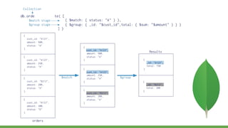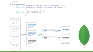 - Aggregation operations group and transform data from multiple documents. Map-reduce is an alternative but less efficient.