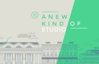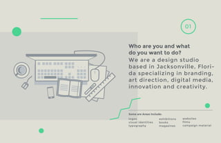 The document introduces a design studio based in Jacksonville, Florida, specializing in branding and digital media while emphasizing problem-solving through design. The studio aims to support start-ups, small businesses, and nonprofits to reach their potential by providing innovative and custom solutions. They believe in the importance of integrating design with business and technology to foster a powerful design community in Jacksonville.