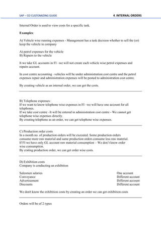 The document is a comprehensive SAP CO customizing guide focused on internal orders, detailing their creation, management, and reporting processes. It outlines the steps for configuring order types, changing field status variants, and creating GL accounts, along with the examples of real and statistical orders for various expense tracking purposes. The guide includes testing procedures for posting documents and running reports to analyze costs associated with different internal orders.