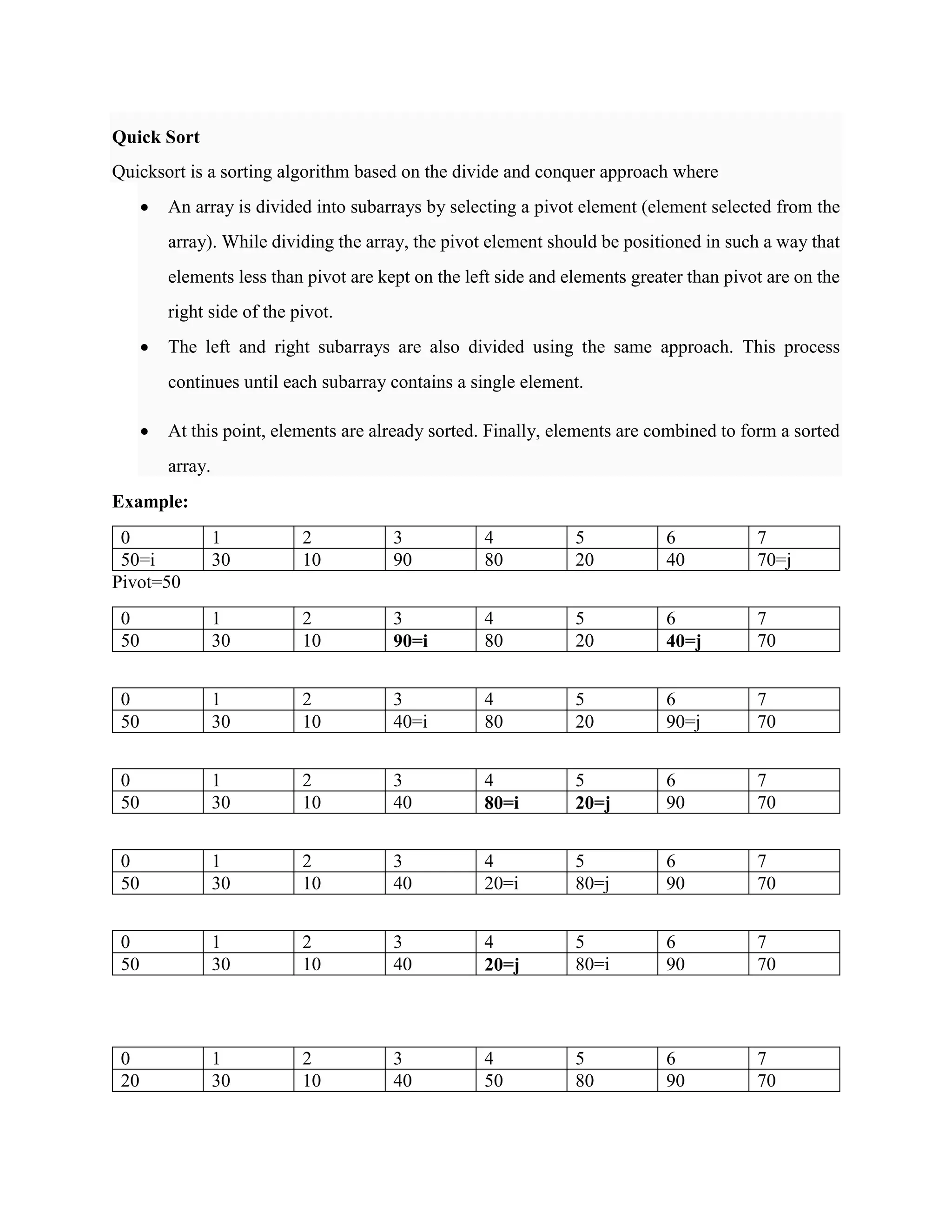 Quicksort is a sorting algorithm that uses a divide and conquer approach. It works by selecting a pivot element and partitioning the array around the pivot so that elements less than the pivot are to its left and greater elements are to its right. It then recursively applies this process to the subarrays until each contains a single element, at which point the array is fully sorted. The example demonstrates quicksort sorting an array from 0 to 7.
