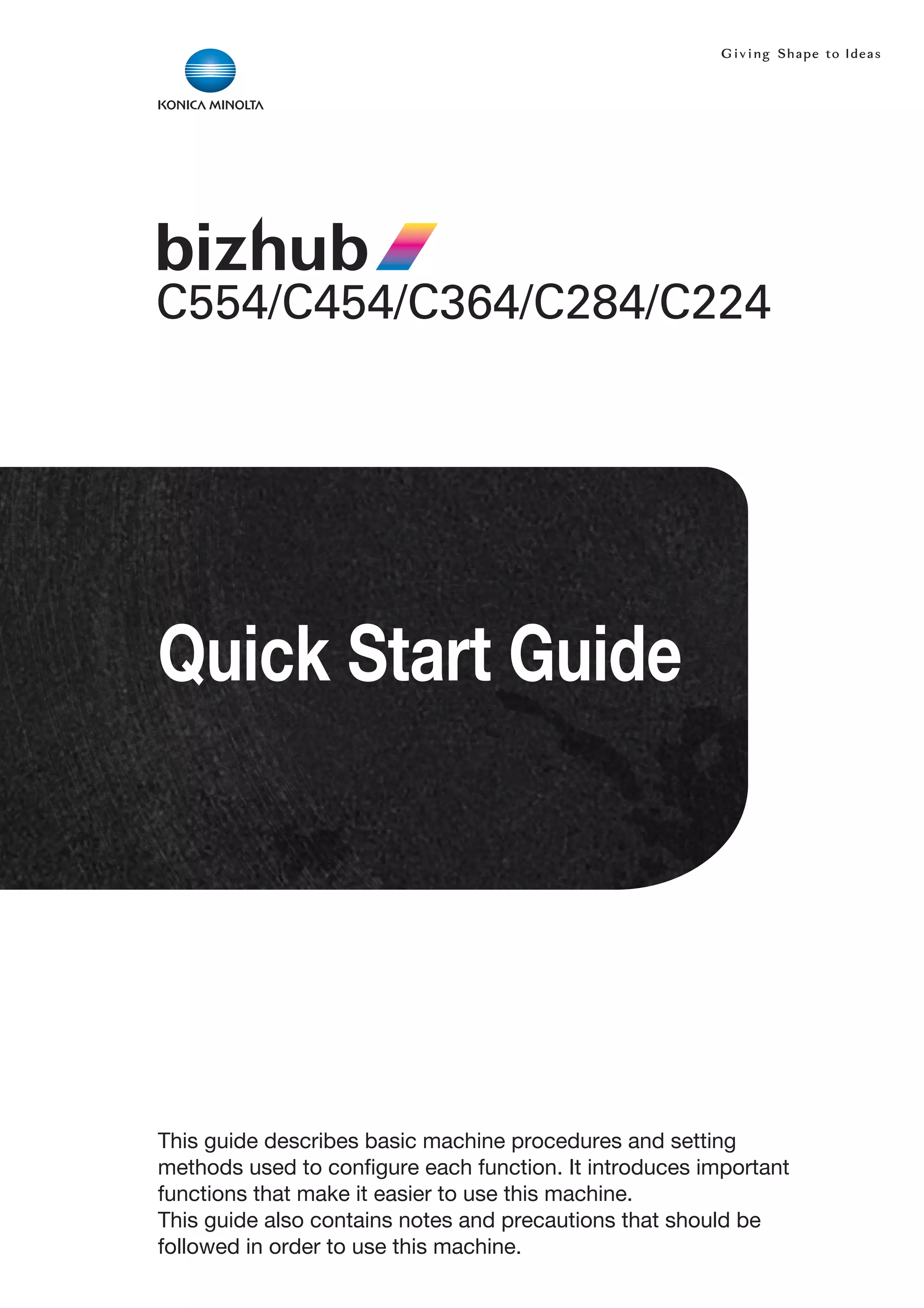 This quick start guide provides basic instructions for setting up and using the machine. It explains important functions and safety precautions. The guide has sections on environmental features, regulations, setup requirements, operation instructions, and legal restrictions. It also lists the machine's components and identifies the names of each part.