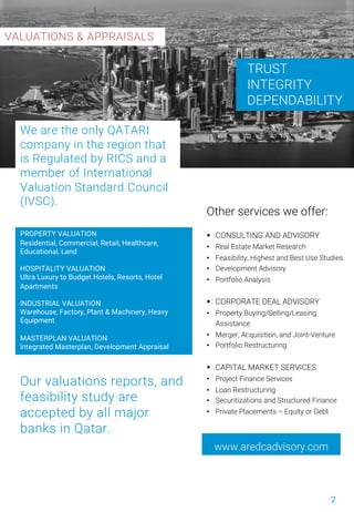 This document provides a summary of Qatar's real estate market for August 2020. Transaction volumes declined 22.8% month-over-month but increased 206.8% year-over-year. While transaction counts fell, overall transaction values increased 49.5% month-over-month and 317% year-over-year, driven primarily by vacant land and residential properties. The hotel sector continues to struggle with occupancy rates down compared to last year. Rental rates for residential and commercial properties have remained stable with incentives offered to tenants.