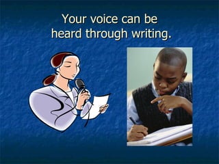 The document provides guidance on organizing writing with an introduction, body paragraphs, and conclusion. It stresses that writing should communicate thoughts and feelings with voice, and organizing ideas is important. Writing should introduce the subject in the first paragraph, elaborate on it in following body paragraphs, and conclude by tying the ideas together.