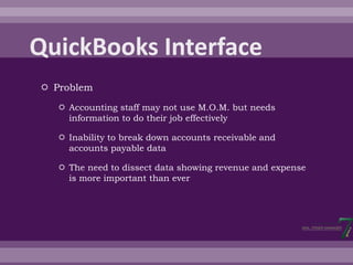 QuickBooks and the Impact on Your Business discusses an interface that allows accounting staff to access detailed accounts receivable and payable data from QuickBooks, addressing problems where staff previously lacked necessary information and had difficulty breaking down financial data. The interface transfers detailed information to QuickBooks, giving accounting staff the ability to see full details of receivables and payables and easily track data, helping them do their jobs more effectively.