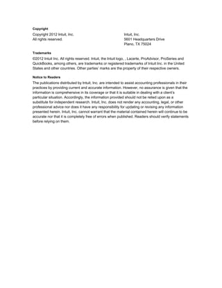 The document provides an overview of QuickBooks Statement Writer 2012, detailing its features, benefits, and use cases for accounting professionals. It emphasizes the ability to create customized financial statements efficiently, while integrating with Excel and Word for improved reporting. The document also includes examples and guidelines for maximizing productivity and compliance in report preparation.