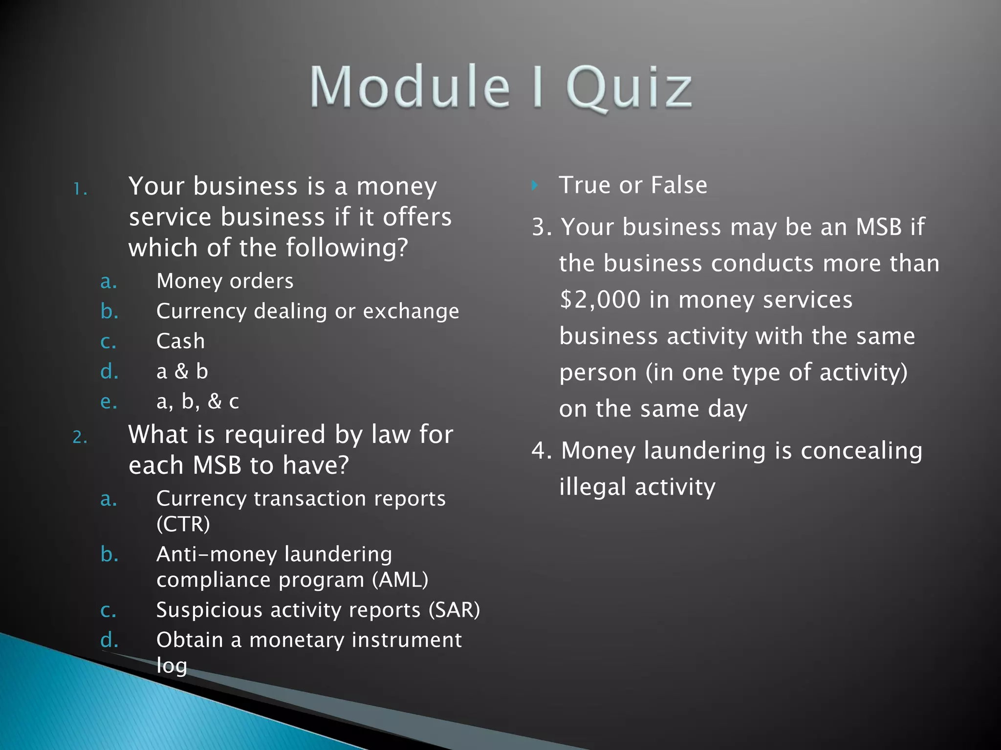 A business is a money service business (MSB) if it offers money orders, currency dealing or exchange, or cash services. Each MSB is required by law to have currency transaction reports, an anti-money laundering compliance program, and file suspicious activity reports. A business may be an MSB if it conducts more than $2,000 in money services with the same person in one day.
