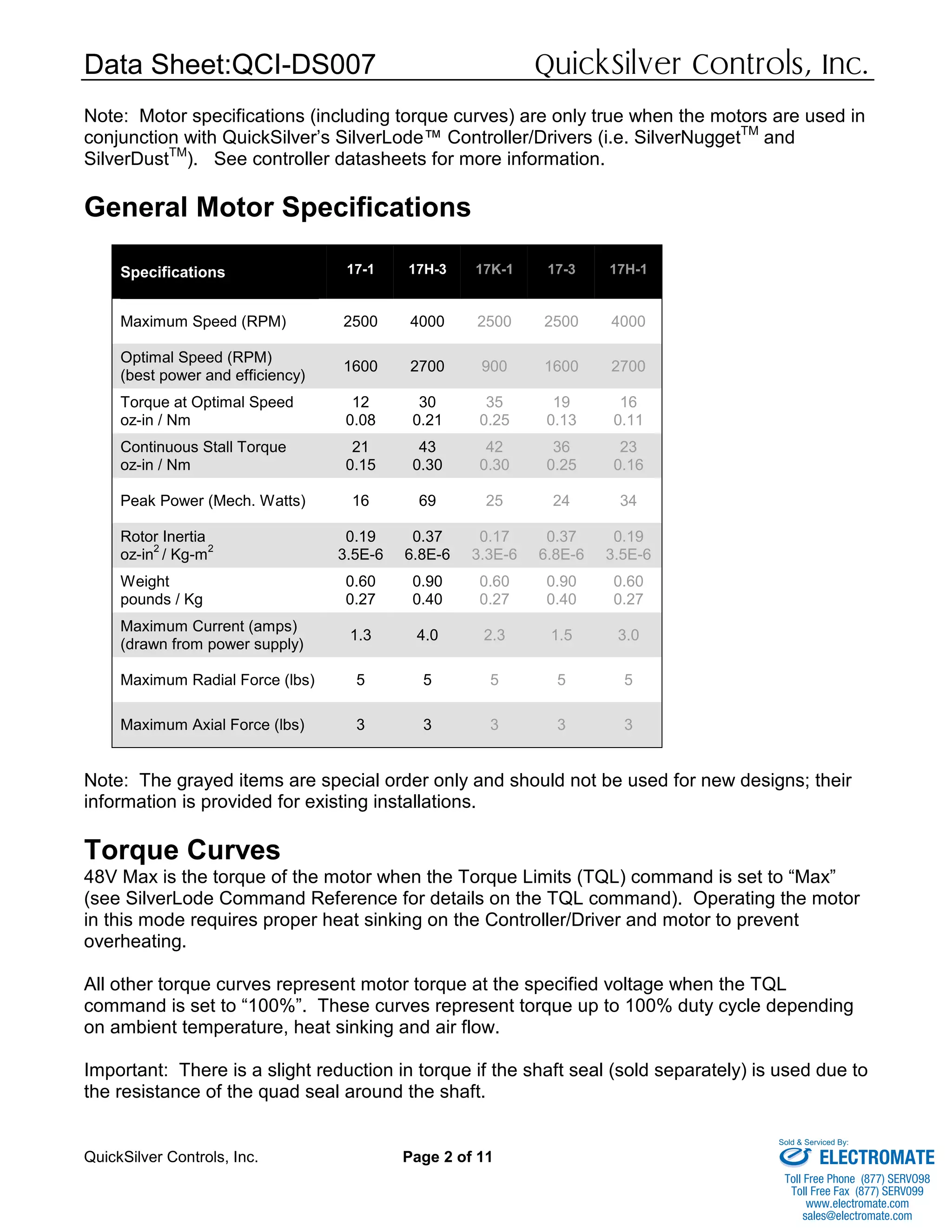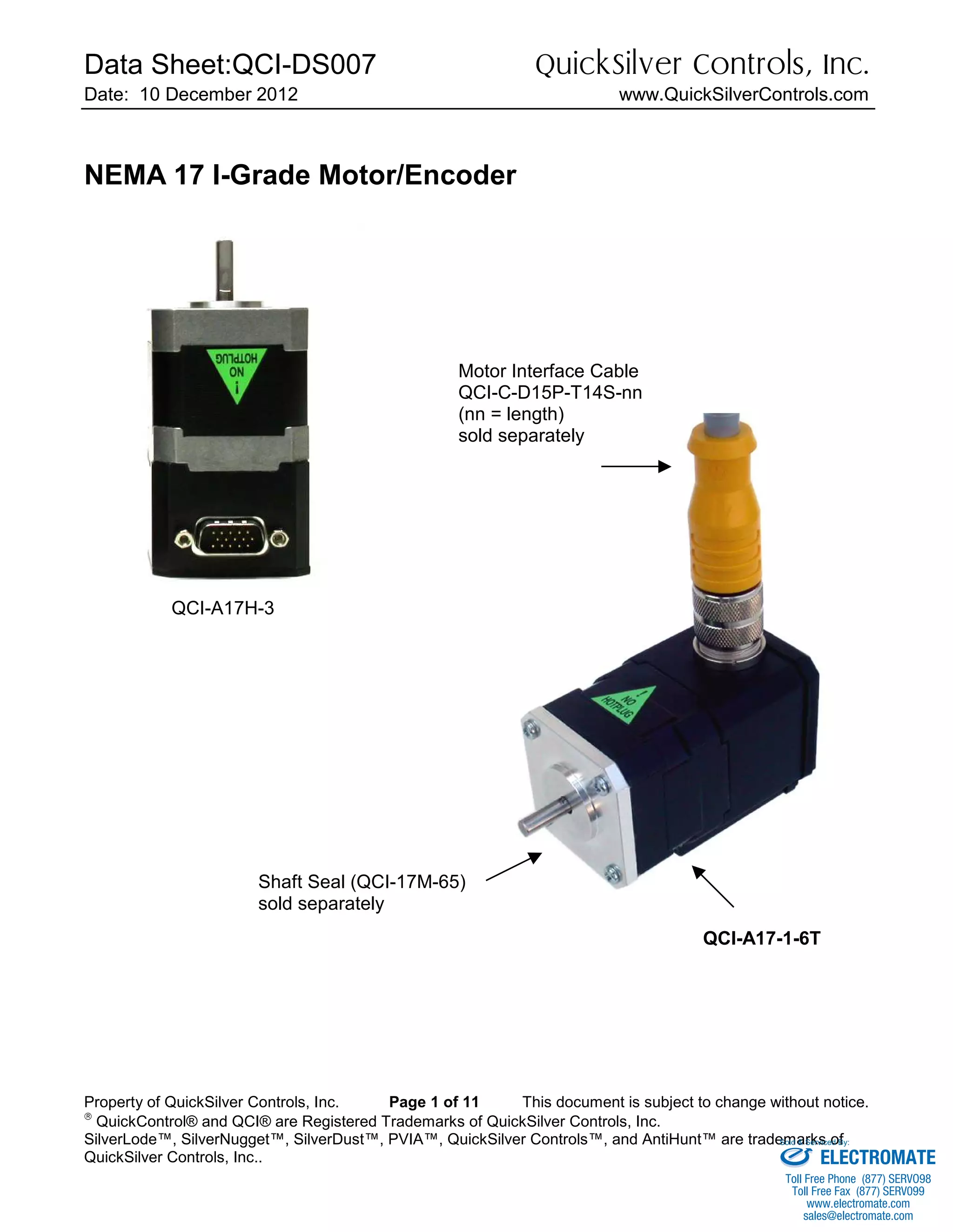 This document provides specifications for QCI NEMA 17 I-Grade motors. It includes general motor specifications, torque curves, electrical specifications, mechanical specifications, environmental specifications, and recommendations for compatible controller/drivers and other components. The document contains detailed technical information on QCI's NEMA 17 stepper motors in 3 sentences or less.