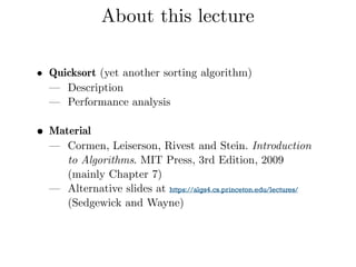 The document covers the Quicksort algorithm, a divide-and-conquer sorting method that efficiently sorts an array by partitioning elements around a pivot. Originating from Tony Hoare's work in 1959, it has an average time complexity of O(n log n), requiring minimal memory as it operates in place. It details the steps of partitioning and recursive sorting of sub-arrays, culminating in a sorted array.