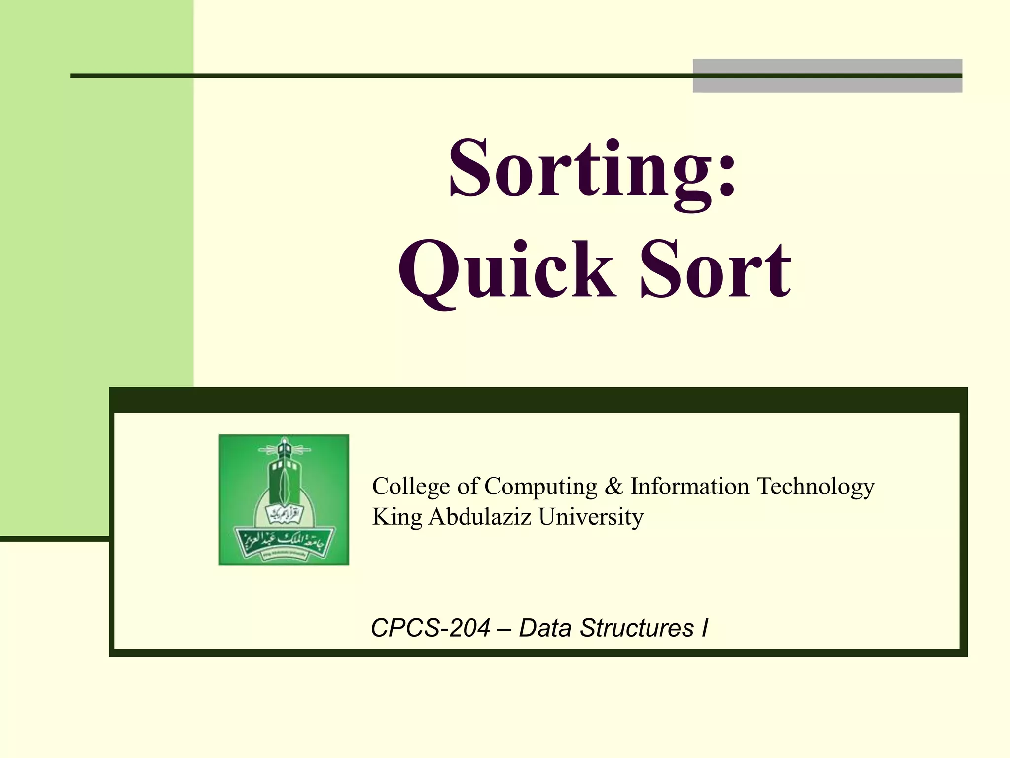 This document discusses quick sort, one of the most common sorting algorithms. Quick sort uses two main ideas - partitioning and recursion. It works by partitioning an array around a pivot element, and then recursively sorting the subarrays on each side of the pivot. In the best case, where the pivot always partitions the array in half, quick sort runs in O(n log n) time. However, its performance depends on how well it can partition the array on each iteration. The document provides pseudocode for quick sort and discusses strategies for choosing a good pivot element to improve its average runtime.