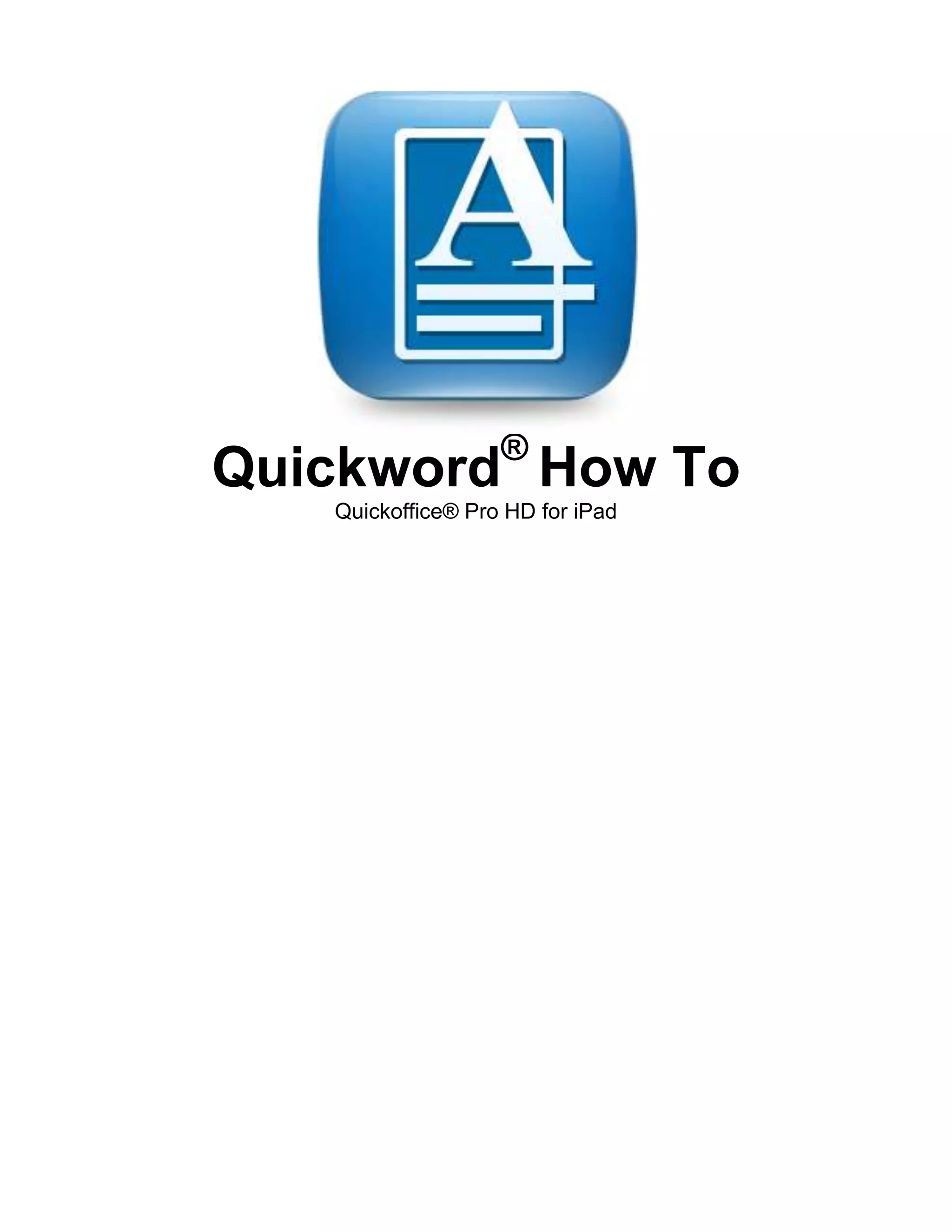 Quickword allows you to open, view, edit, and save Microsoft Word documents on your iPad. It provides tools for zooming, scrolling, and following hyperlinks. You can format text with fonts, sizes, styles, colors and edit paragraphs. Tracking changes and comments can be reviewed, accepted or rejected. Other tools include spell check, dictionary lookup, find and replace, word count, and print or save options.