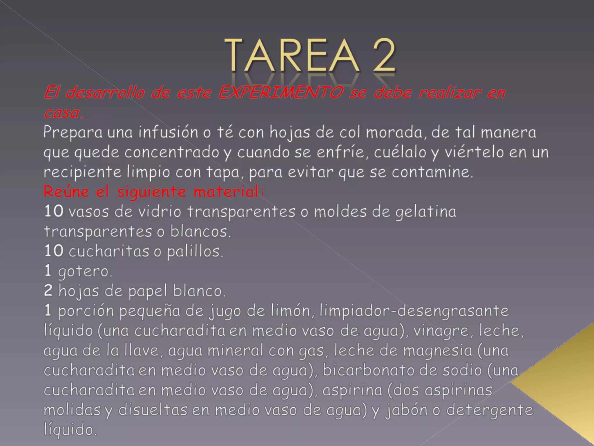 El documento instruye a un estudiante a verter una infusión en varios recipientes que contienen diferentes sustancias como leche, agua mineral, vinagre y bicarbonato para observar los resultados y medir las concentraciones de pH. Se recomienda agregar la infusión a los recipientes uno por uno para poder observar detenidamente los cambios en cada sustancia.
