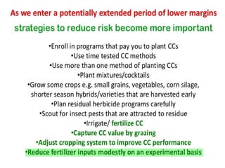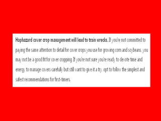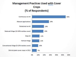The document discusses the management and benefits of using cover crops in corn/soybean rotations, emphasizing their role in improving soil health and crop yields. It includes practical information on costs, planting techniques, and herbicide considerations, while also presenting survey results regarding cover crop adoption among Illinois farmers. Key questions and concerns from farmers about cover crop practices are addressed, indicating the increasing importance and complexity of implementing cover crops effectively.