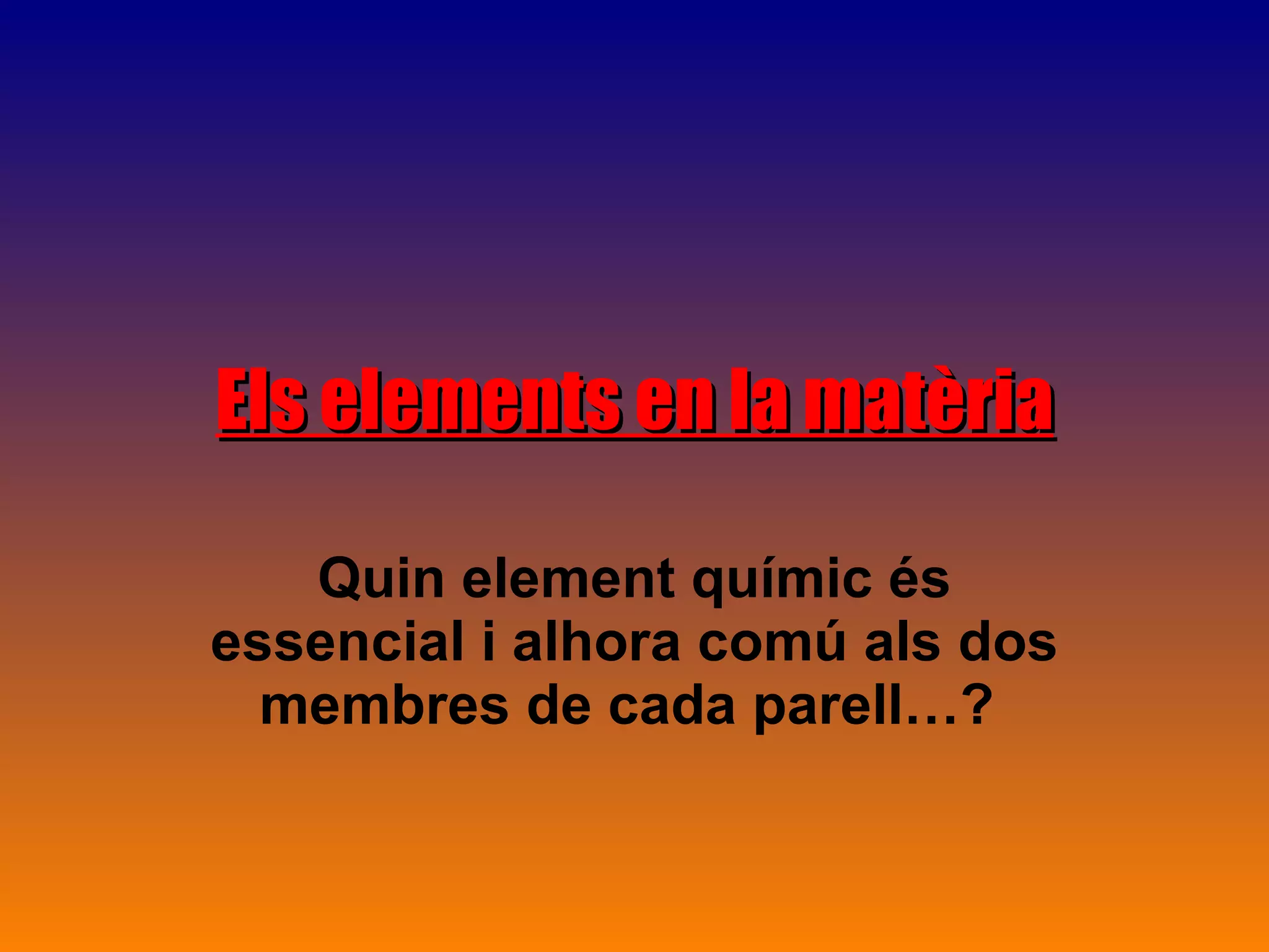 Els elements enla matèria Quin element químic és essencial i alhora comú als dos membres de cada parell…?