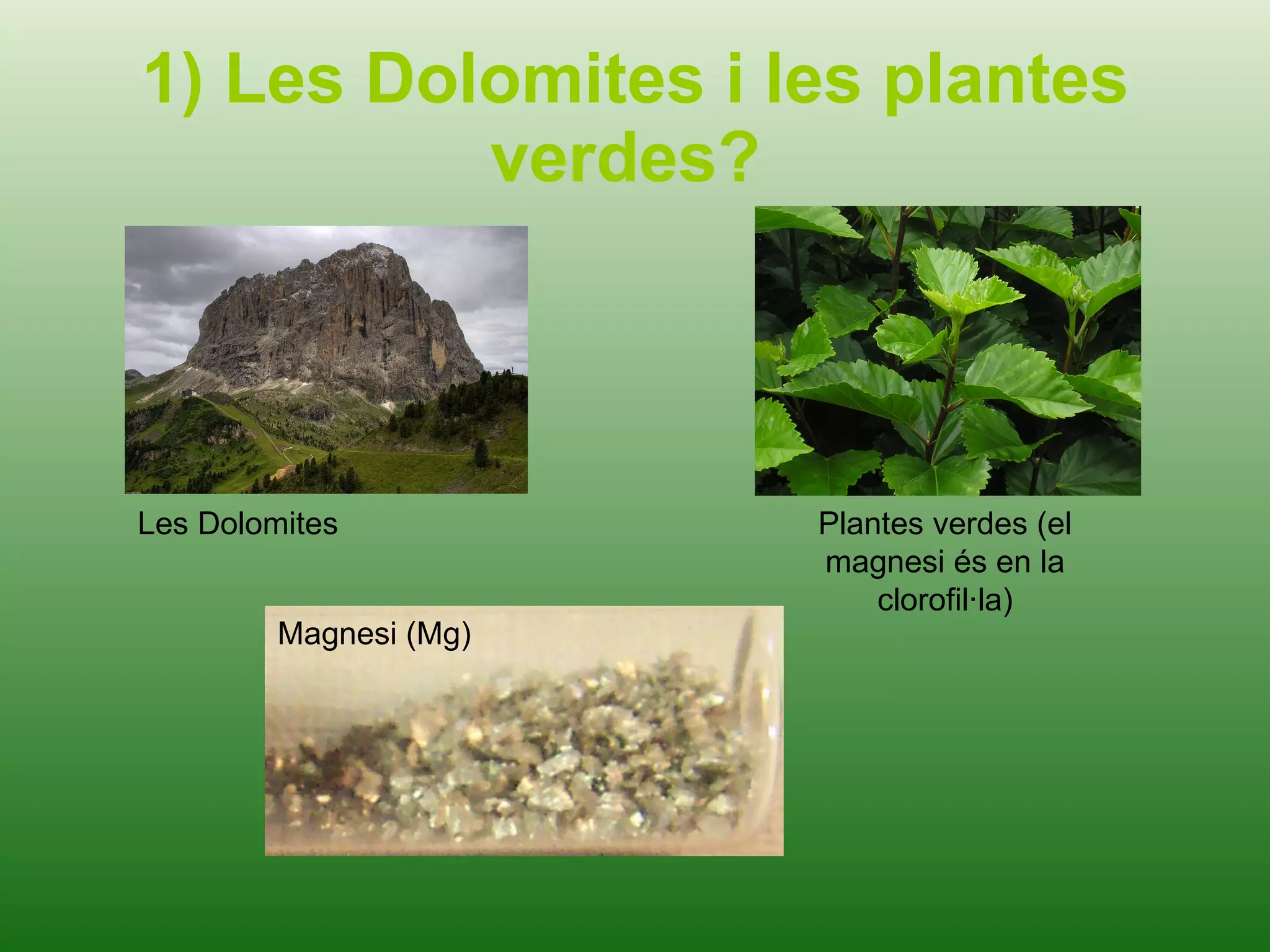 1) Les Dolomitesi les plantes verdes? Magnesi (Mg) Les Dolomites Plantes verdes (el magnesi és en la clorofil·la)