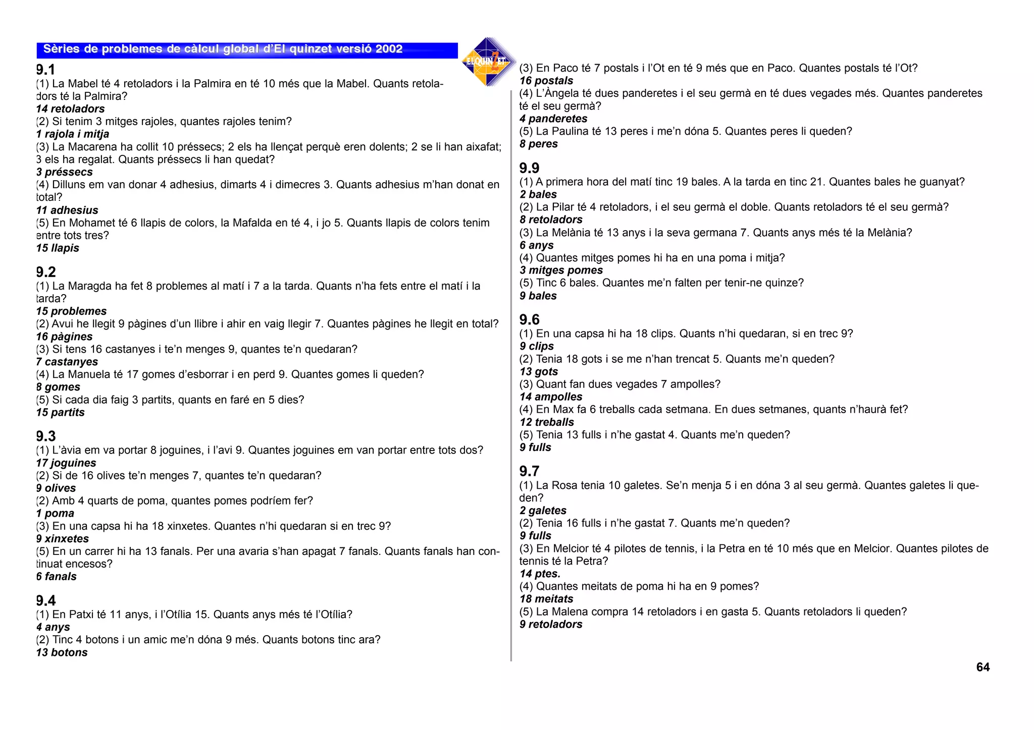 (1) En Patxi té 11 anys, i l’Otília 15. Quants anys més té l’Otília? (5) La Malena compra 14 retoladors i en gasta 5. Quants retoladors li queden?