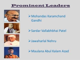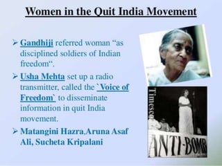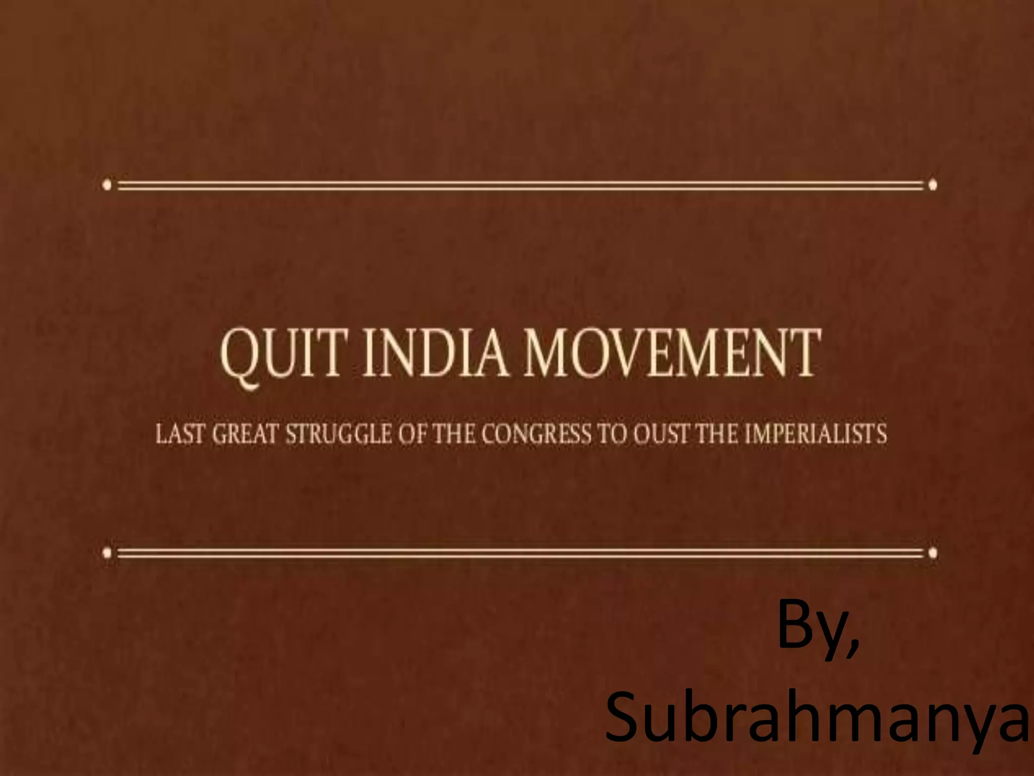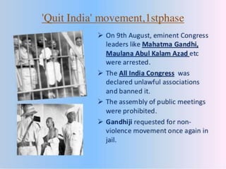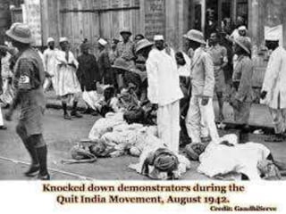 The Quit India Movement was a civil disobedience campaign initiated in August 1942, urging for immediate Indian independence from British rule, led by Mahatma Gandhi. Despite the mass protests and calls for passive resistance, the movement lasted only three months and ultimately failed due to tactical organizational mistakes, loyalty of governmental services, and the physical strength of the British government. Historians attribute the movement's shortcomings to several key factors outlined by Dr. Amba Prasad.