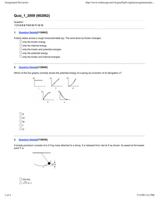 This document previews an assignment with 13 physics questions covering topics like kinetic energy, potential energy, projectile motion, forces, and acceleration. It provides the question text and possible multiple choice answers for each problem.
