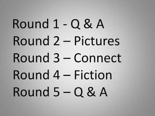 This document outlines the structure and questions for 5 rounds of a trivia quiz. Round 1 is questions and answers on various topics. Round 2 involves identifying people or images. Round 3 connects clues to answers. Round 4 features fictional characters and stories. Round 5 closes with additional questions and answers on historical events, films, sports, and world leaders. The quiz covers topics in history, pop culture, literature, science, and current events.