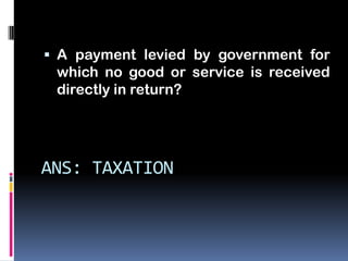 This document contains a quiz about taxation, fiscal policy, and forms of escaping taxation. It defines key terms like taxation, broad basing taxes, adequacy of taxes, fiscal policy, expansionary and contractionary fiscal policy, taxes, corporate taxes, shifting taxes, and capitalization of taxes. The quiz provides definitions and expects the reader to identify the correct term for each definition provided.