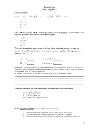 The document provides an overview of three key concepts for making correct exposures in photography: [1] how shutter speed and aperture work together to control the amount of light, [2] the ISO rating of the film, and [3] using a light meter properly by understanding it indicates an exposure to make the subject a middle gray tone. It then presents a 10 question quiz related to these exposure fundamentals, covering topics like shutter speeds, apertures, light meters, and camera exposure modes.