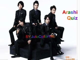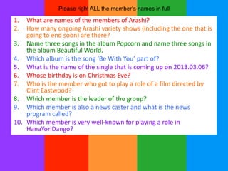 This document is a quiz about the popular Japanese boy band Arashi. It contains 15 multiple choice questions testing knowledge of the band members' names, songs, albums, TV shows, birthdays, and acting roles. The questions require identifying the band members, naming songs from specific albums, and attributing solos to the correct member.