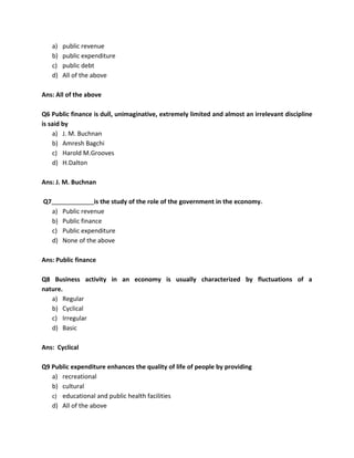 This document contains a 20 question multiple choice quiz on concepts in public finance and economics. The questions cover topics such as the definitions and scopes of public finance and economics, sources of public debt, effects of public expenditure, components of public finance, characteristics of business cycles, types of public facilities, modern terms for public finance, influences of fiscal policy, and differences between public and private finance. The correct answers to each multiple choice question are also provided.