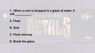 This document contains a 40 question quiz covering various topics in chemistry and science. The questions test knowledge of states of matter, atomic structure, discoveries of scientists, properties of materials, and other foundational science concepts. Some example questions include identifying the state change from liquid to gas as evaporation, knowing protons are positively charged particles located in the atom's nucleus, and recognizing carbon dioxide as the gas released from burning fuel. The quiz covers a wide breadth of scientific topics to assess fundamental chemistry and science understanding.